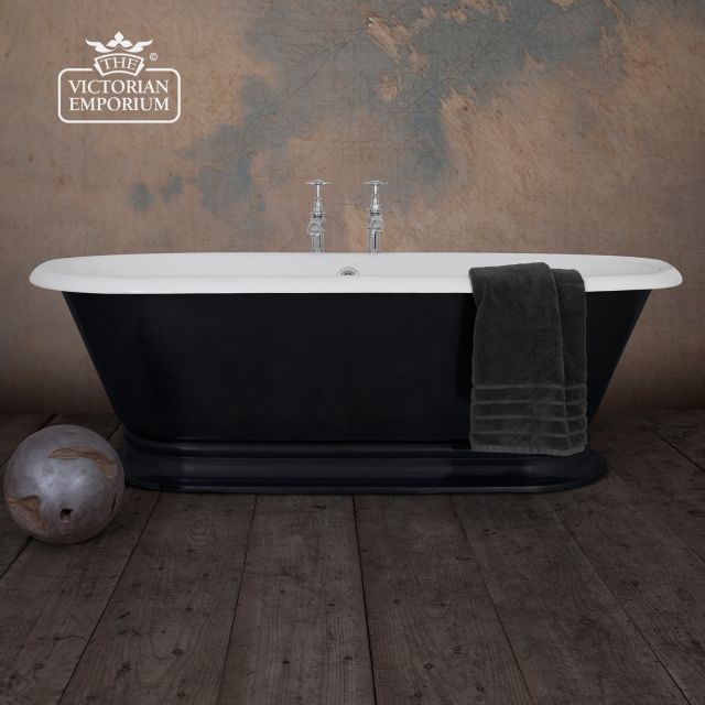 Classic plinth style low profile cast iron bath that is symmetrical in shape with a hard wearing vitreous enamel interior and with a 5 year guarantee. The shape is defined by a full and wide roll that graduates downward with gentle sloping sides.