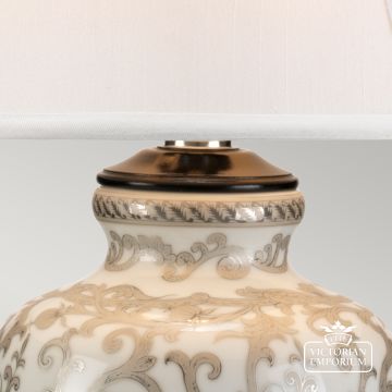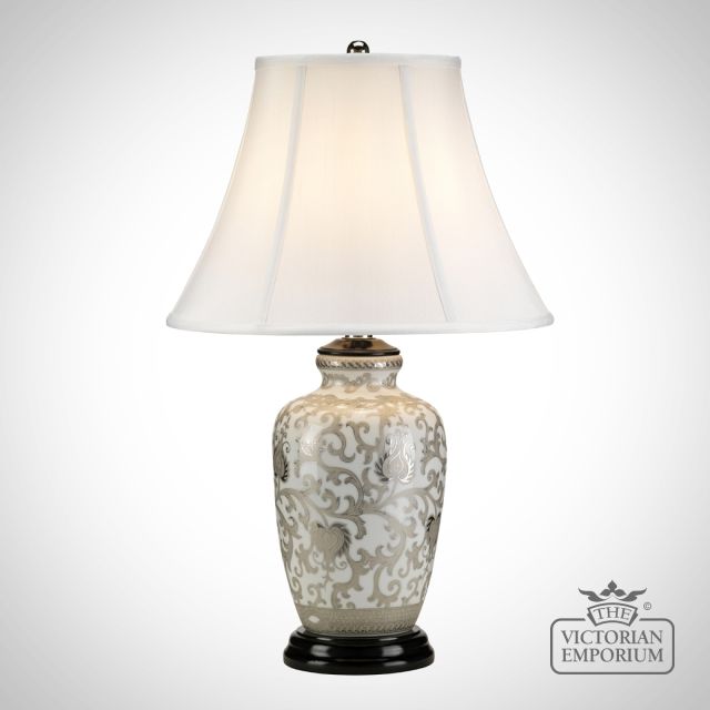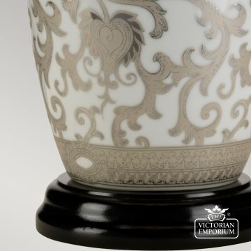 Chinese Porcelain table lamp with a 19cm Silver floral pattern over a White crackle glaze. Fitted with a wooden cap and base, 36cm White polycotton empire shade, and Satin Nickel finial.