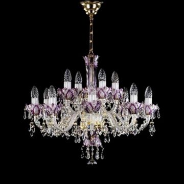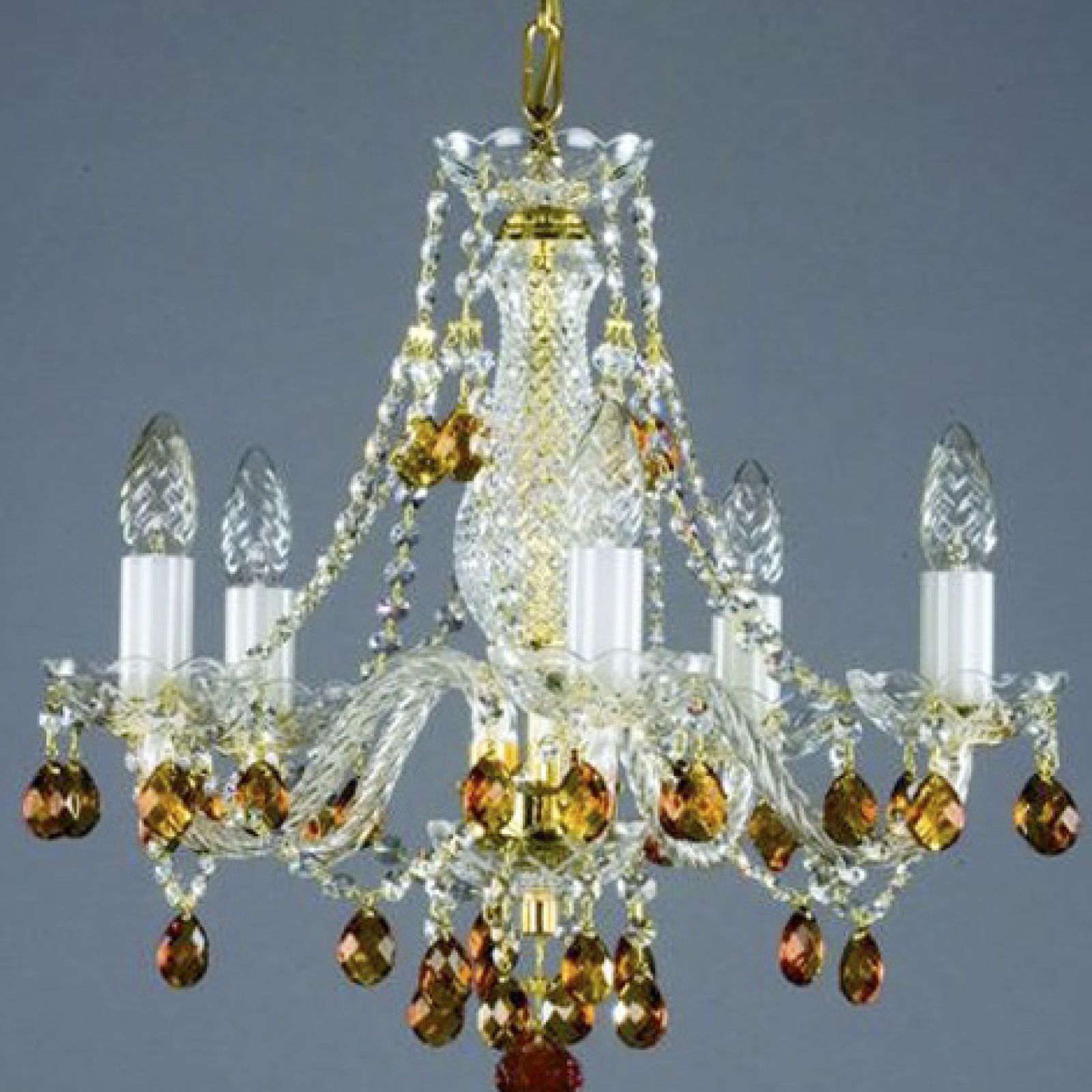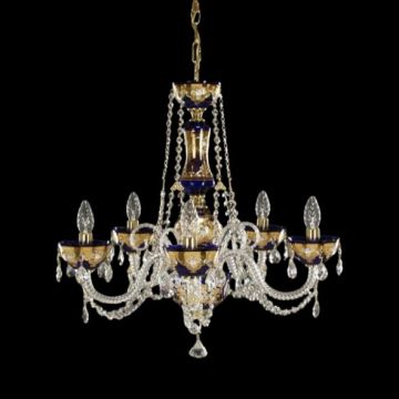 Small 30% PbO bohemian coloured crystal chandelier, with delicate pear shaped drops and crystal chains