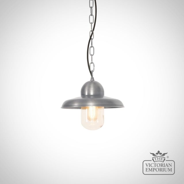 Simple outdoor period style chain lantern in antique nickel, influenced by simple barn lamps of the early 1900’s.