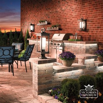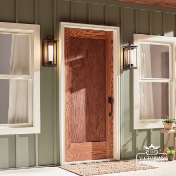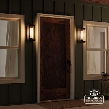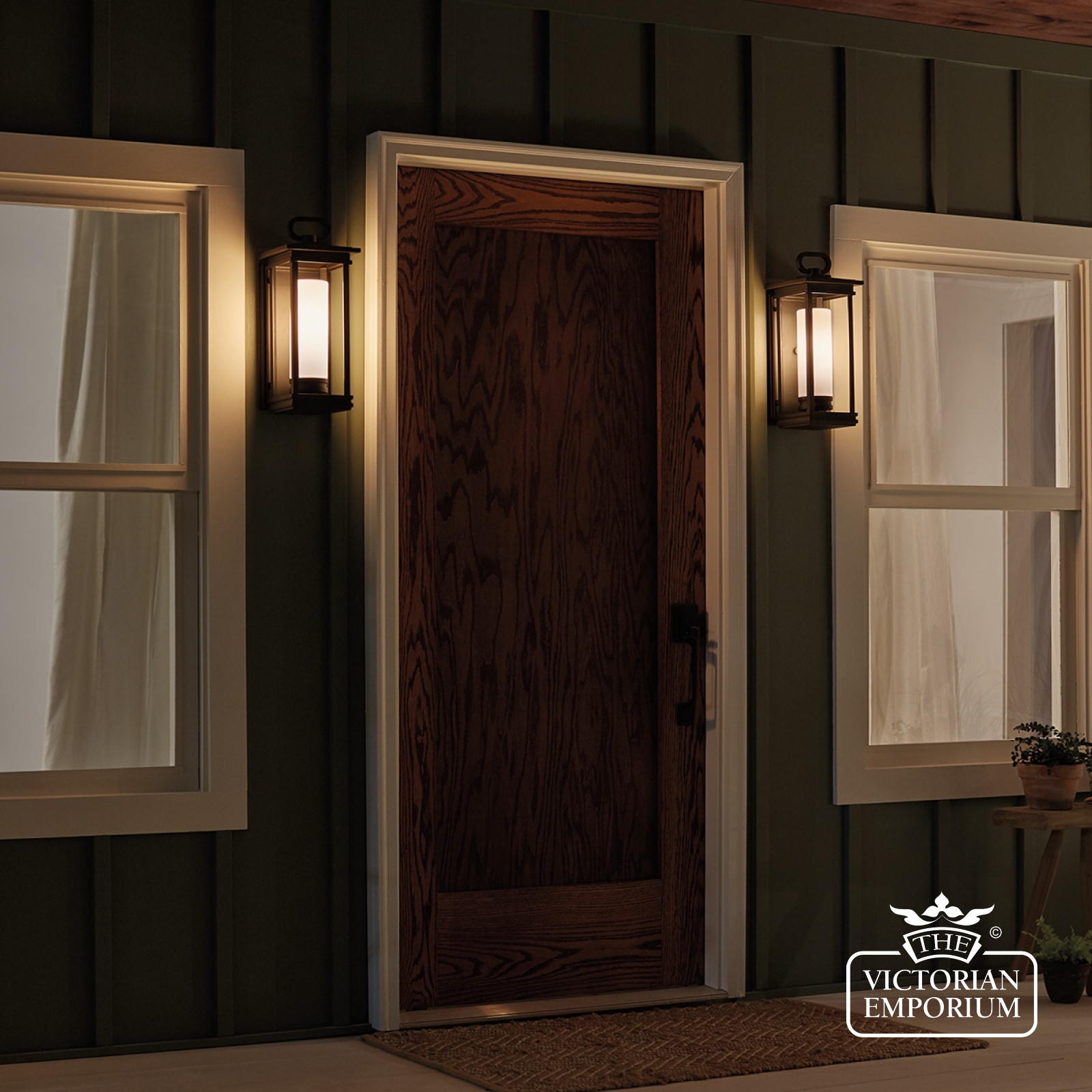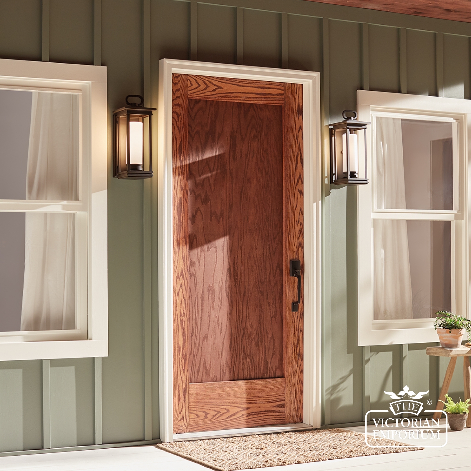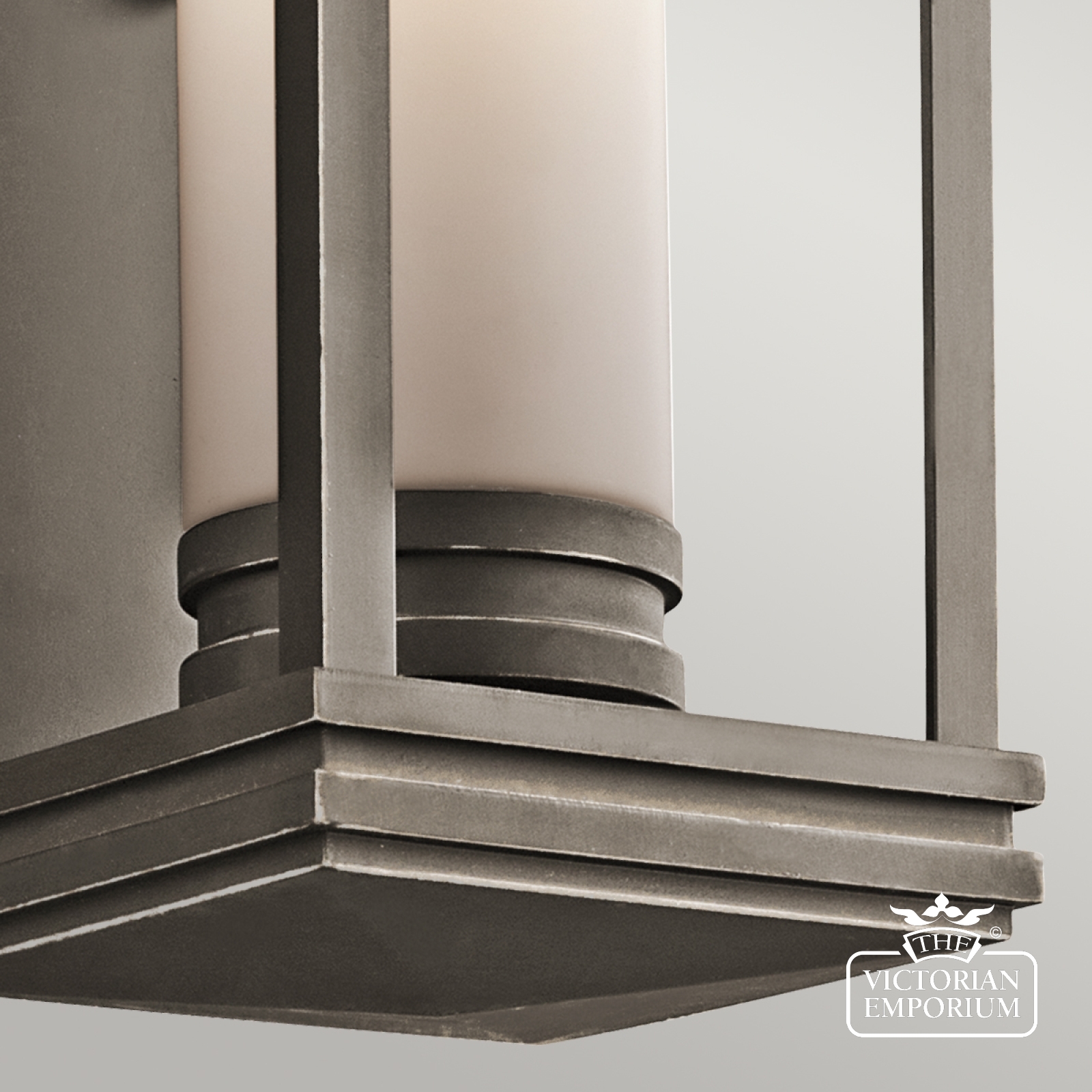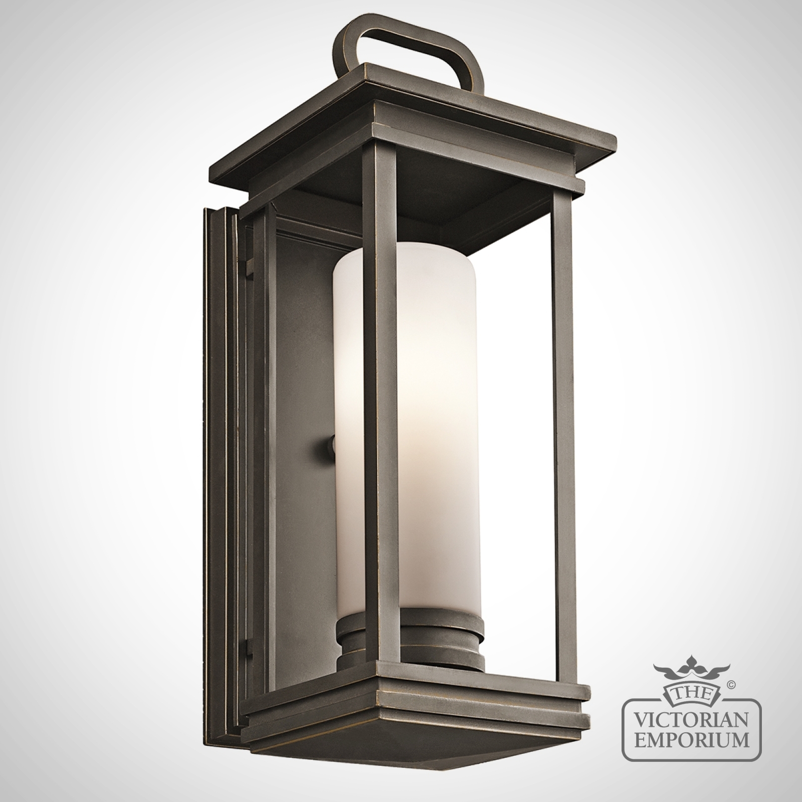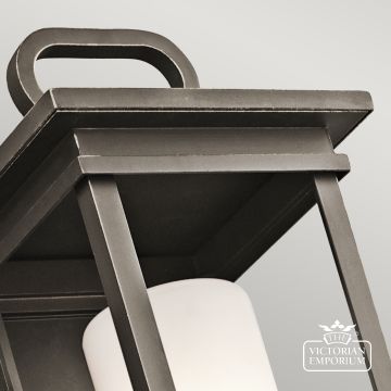 The South Hope collection features a sturdy rectangular design with satin etched cased opal glass. It has an Oil Rubbed Bronze finish. This design can complement any porch or walkway.