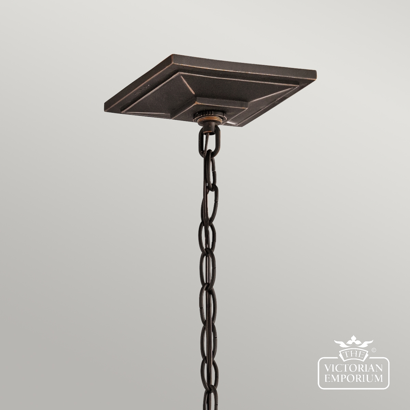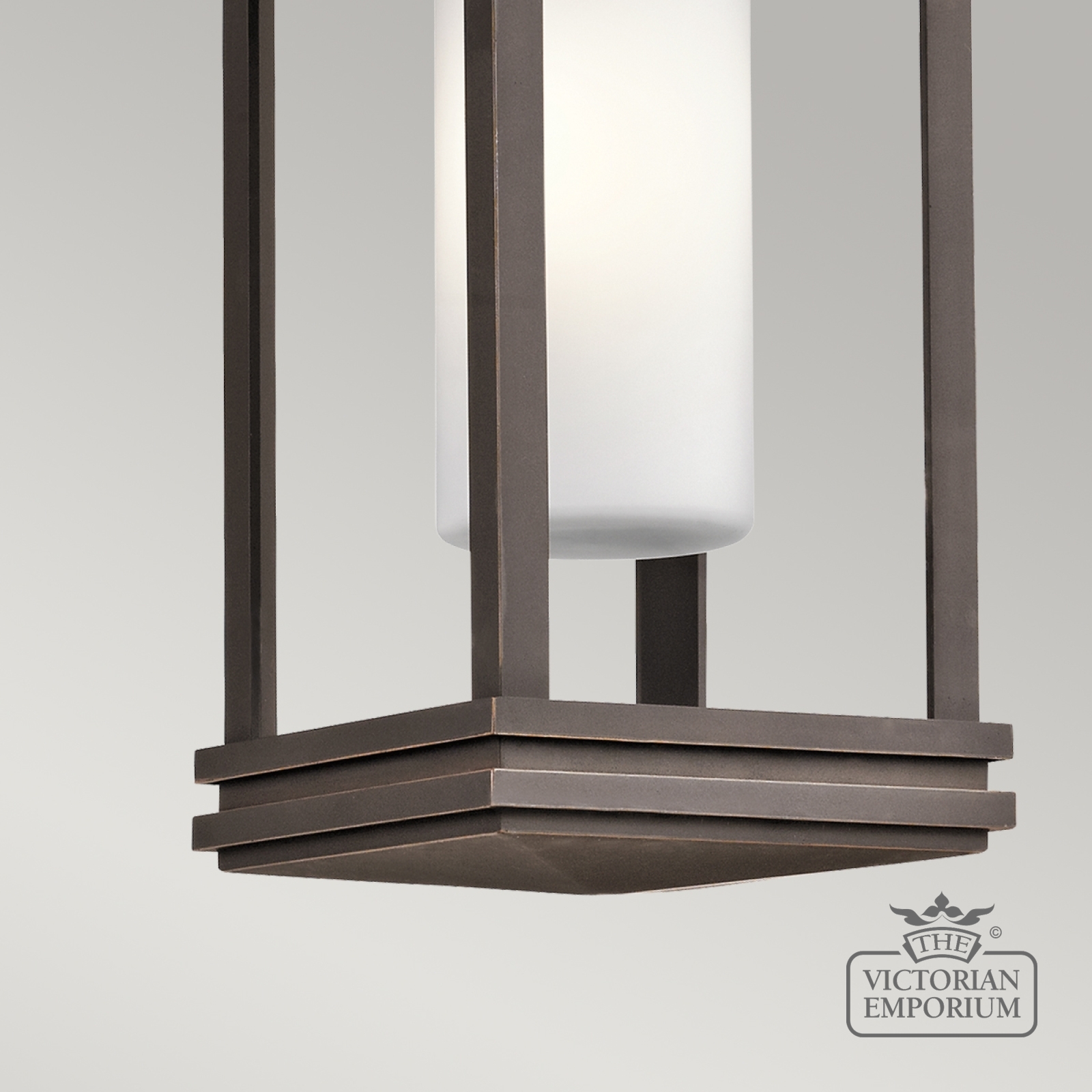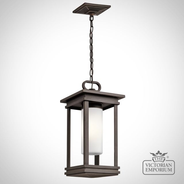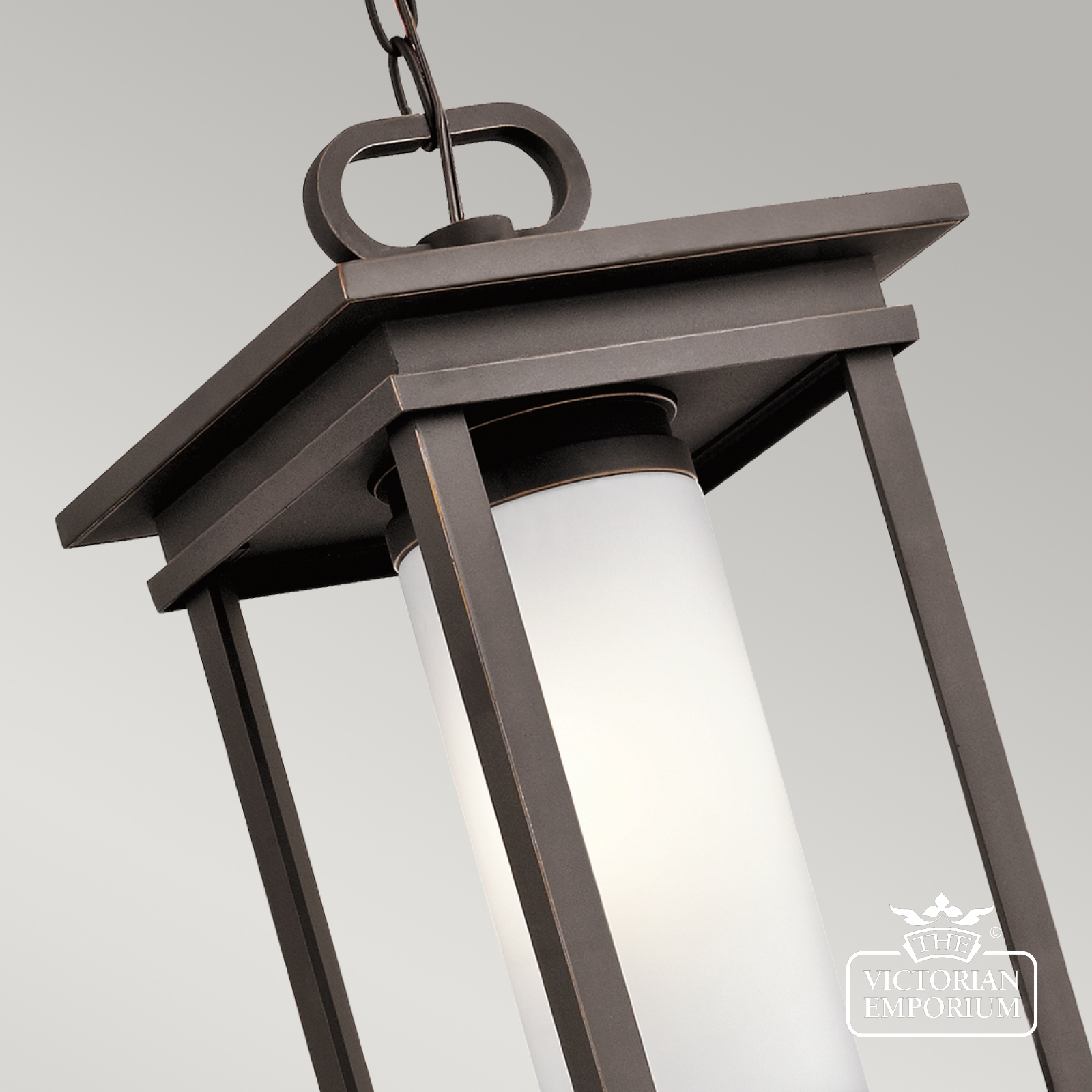 The South Hope collection features a sturdy rectangular design with satin etched cased opal glass. It has an Oil Rubbed Bronze finish. This design can complement any porch or walkway.