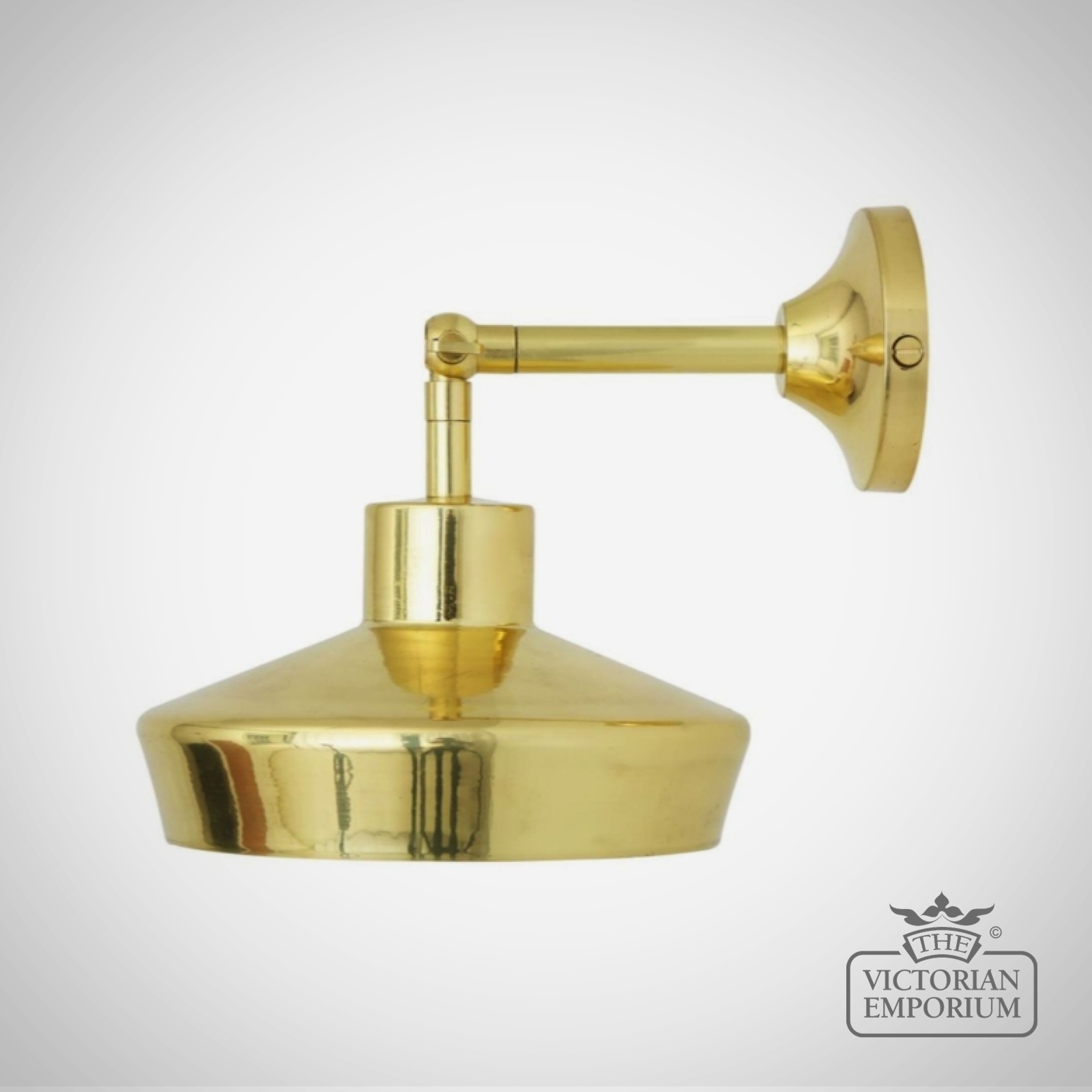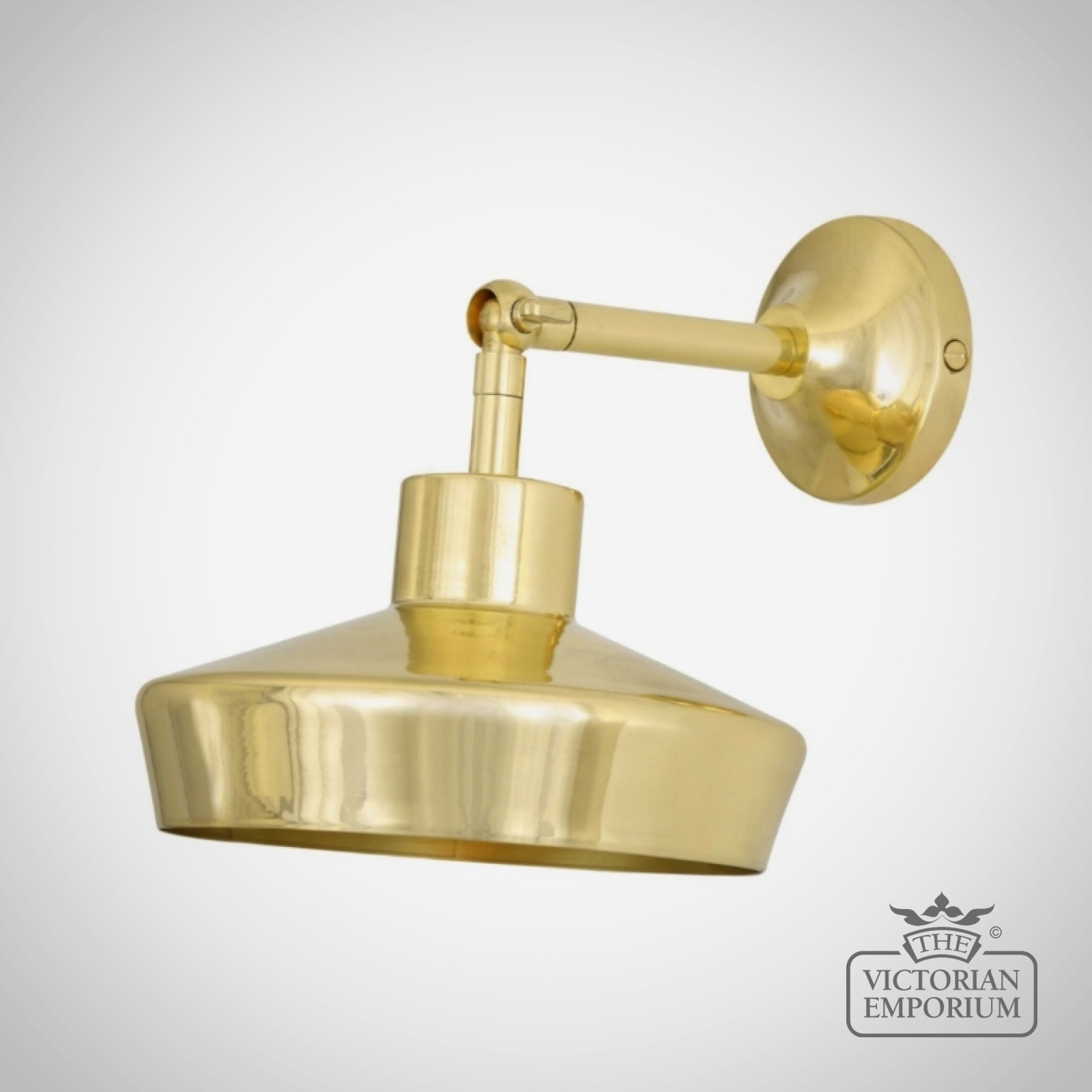 The Splendor wall light is a small, modern wall light with an adjustable arm that protrudes from a concave-shaped wall bracket. An angular brass hat is attached to an adjustable swivel joint that allows the light to be adjusted up or down.