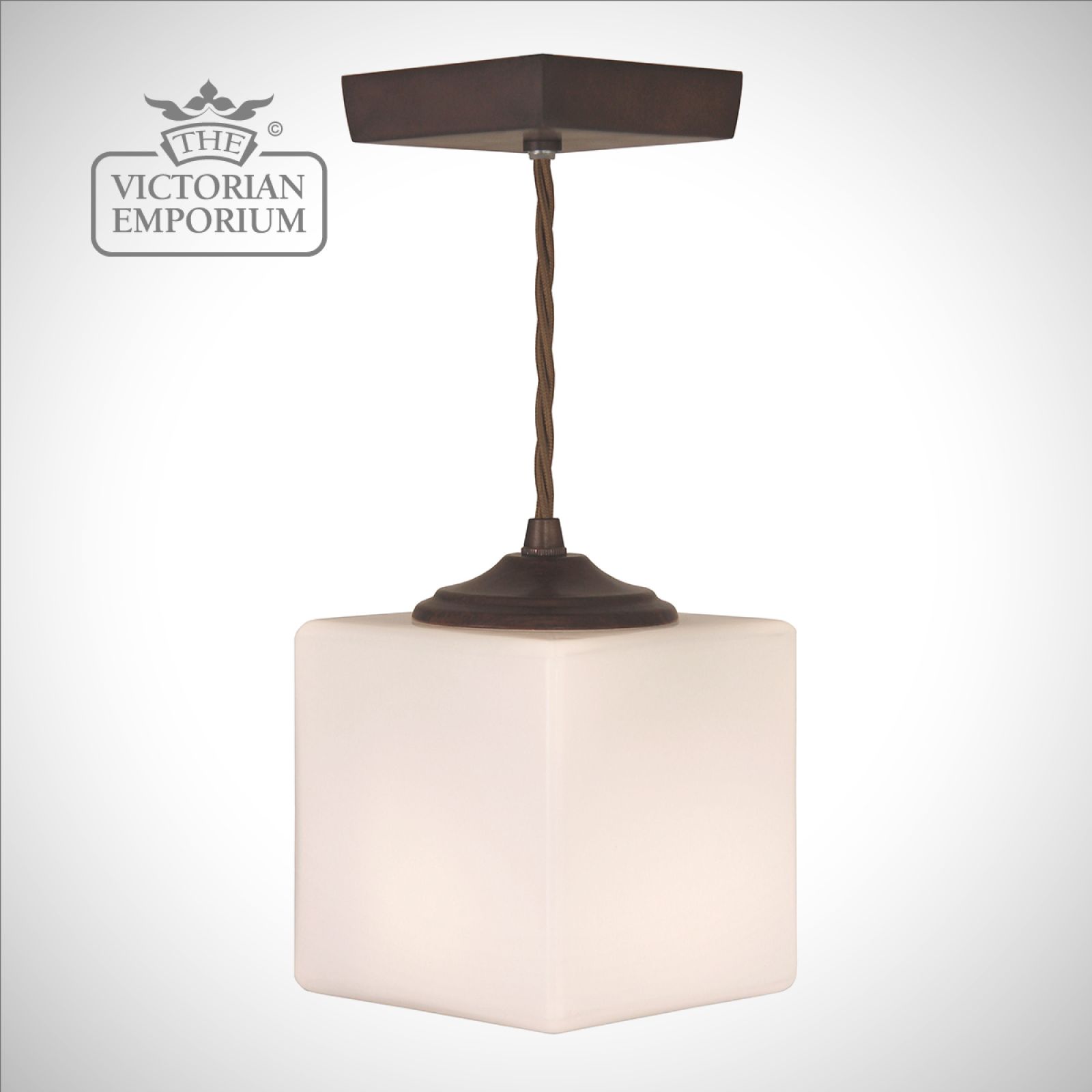 These cube shaped pendants are a twist on the classic flashed opal pendants. Perfect for a room where you require a classic understated lamp