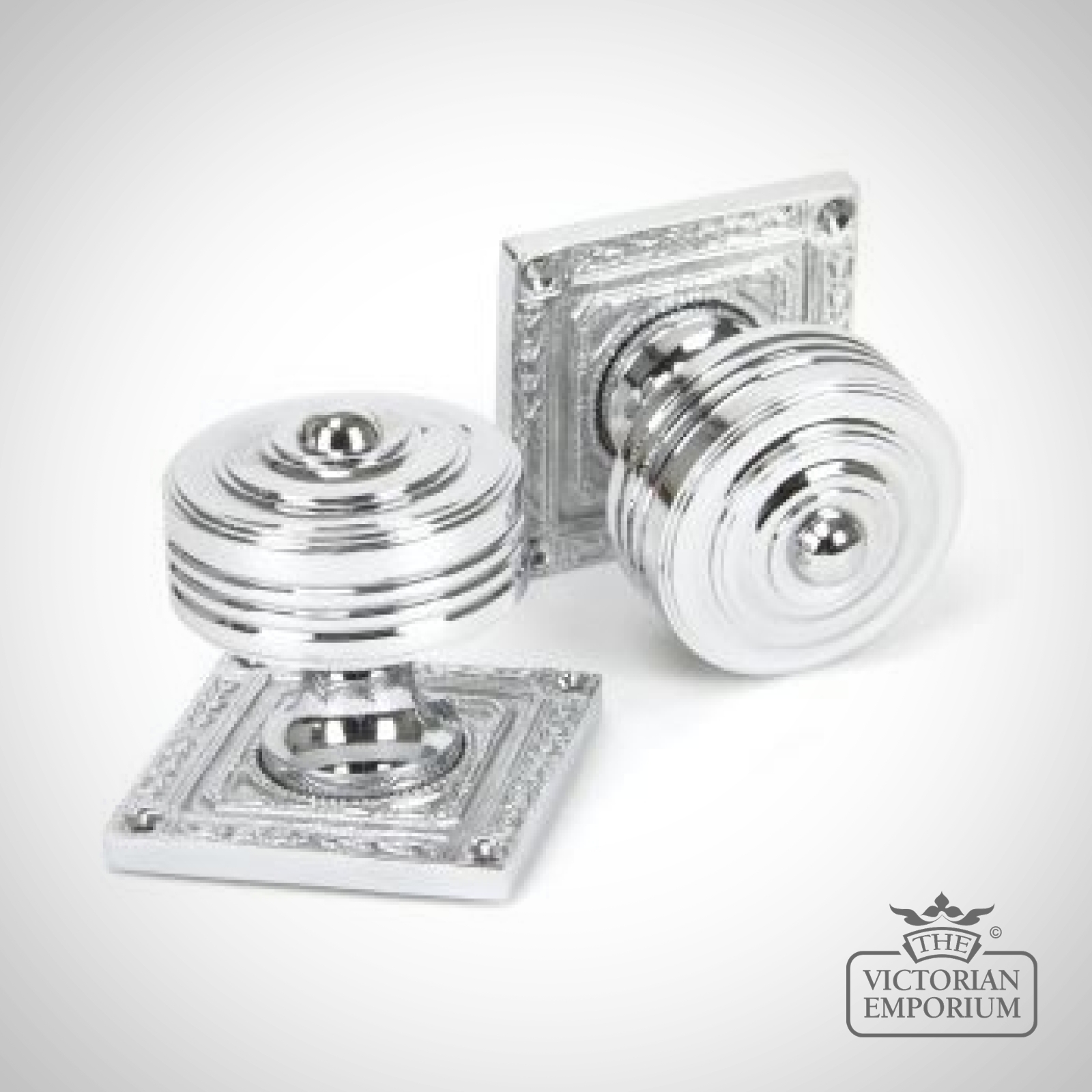 A very ornate, square shaped, decorative pair of unsprung solid door knobs, copied from a Georgian original. Perfectly suited for period properties or town houses to create a genuinely traditional feel. The ageing process used highlights the intricate detailing on the square back plate, offering a contrast to all the highly polished components.These knobs will tarnish in time as part of the ageing process but can be polished up if you want to achieve a sheen.