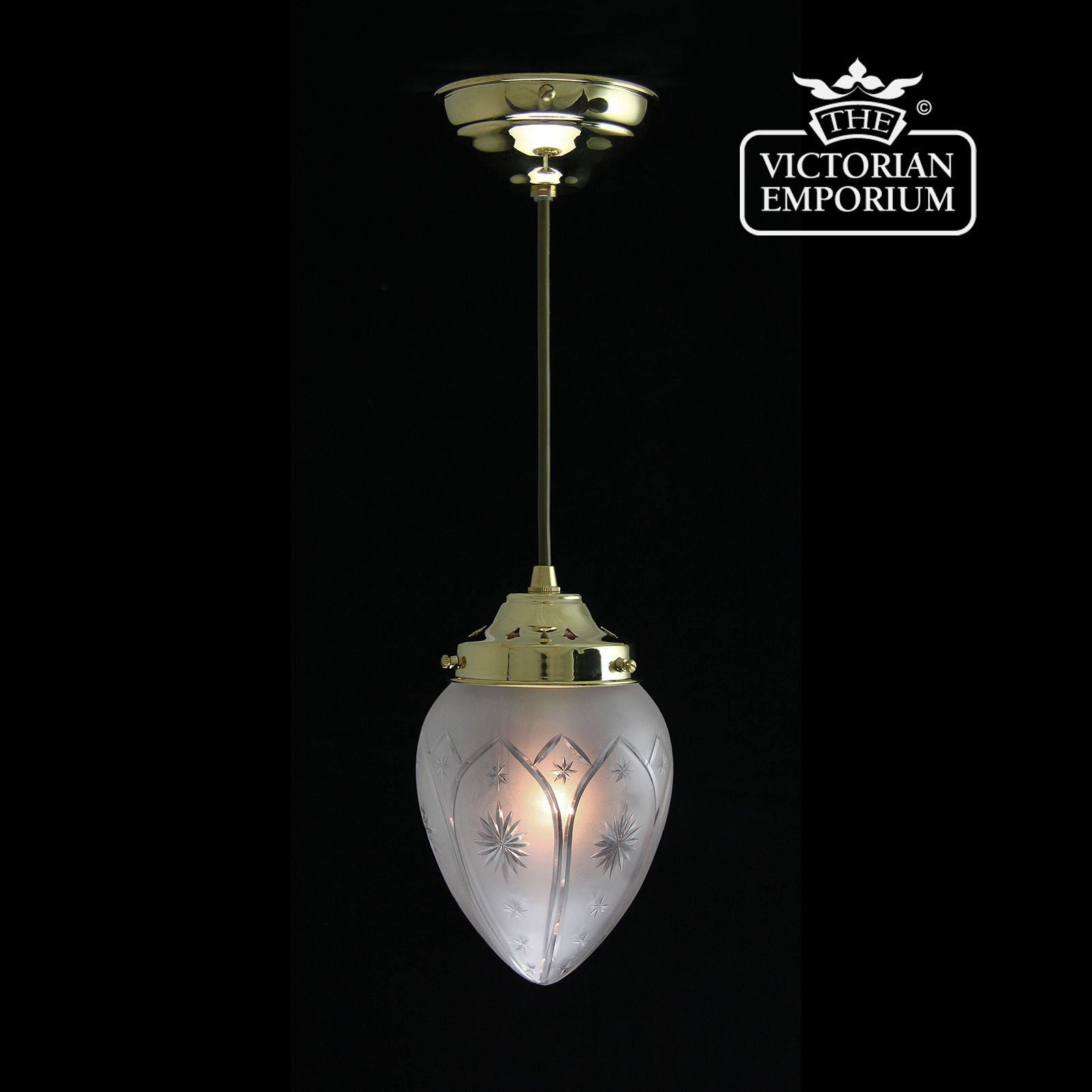 This is a decorative etched cut glass ceiling pendant with brass metalwork and a star design
