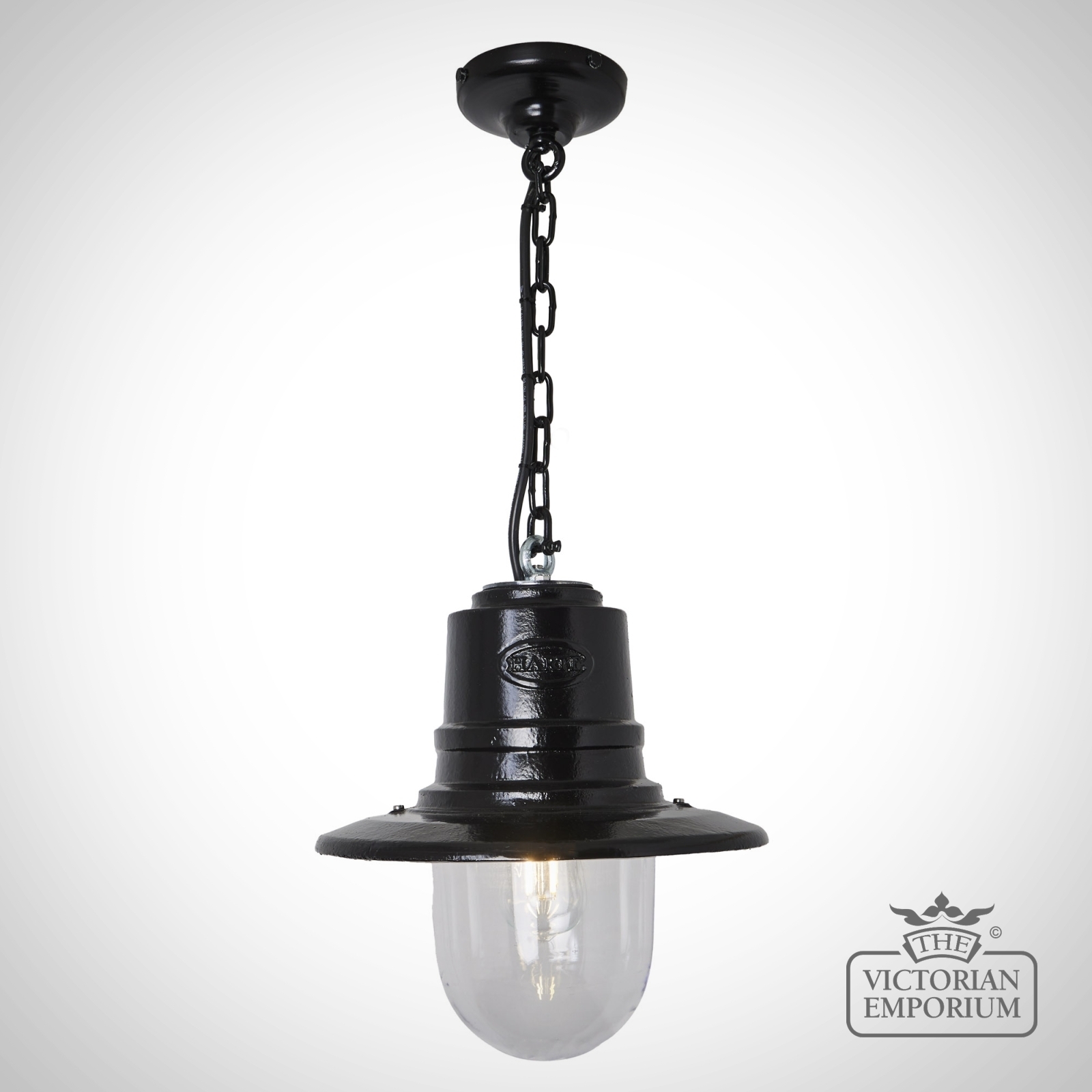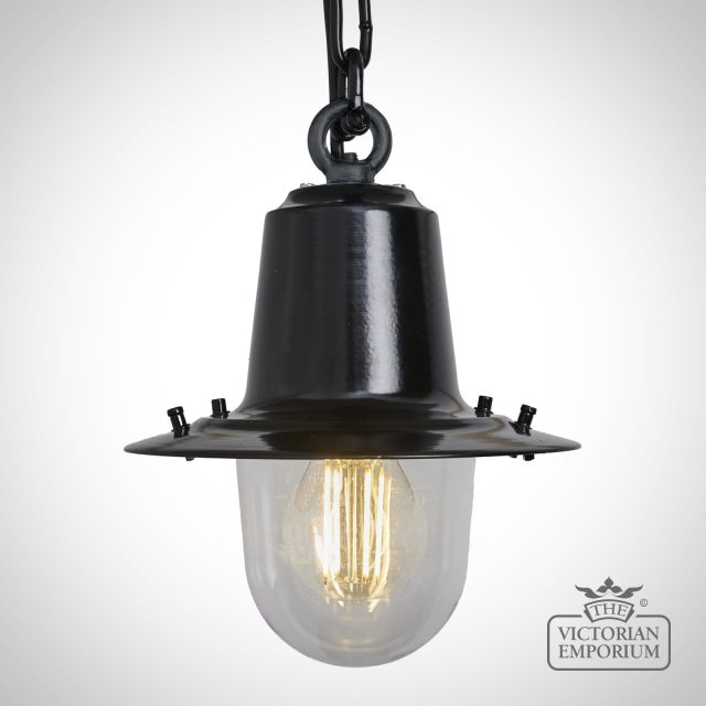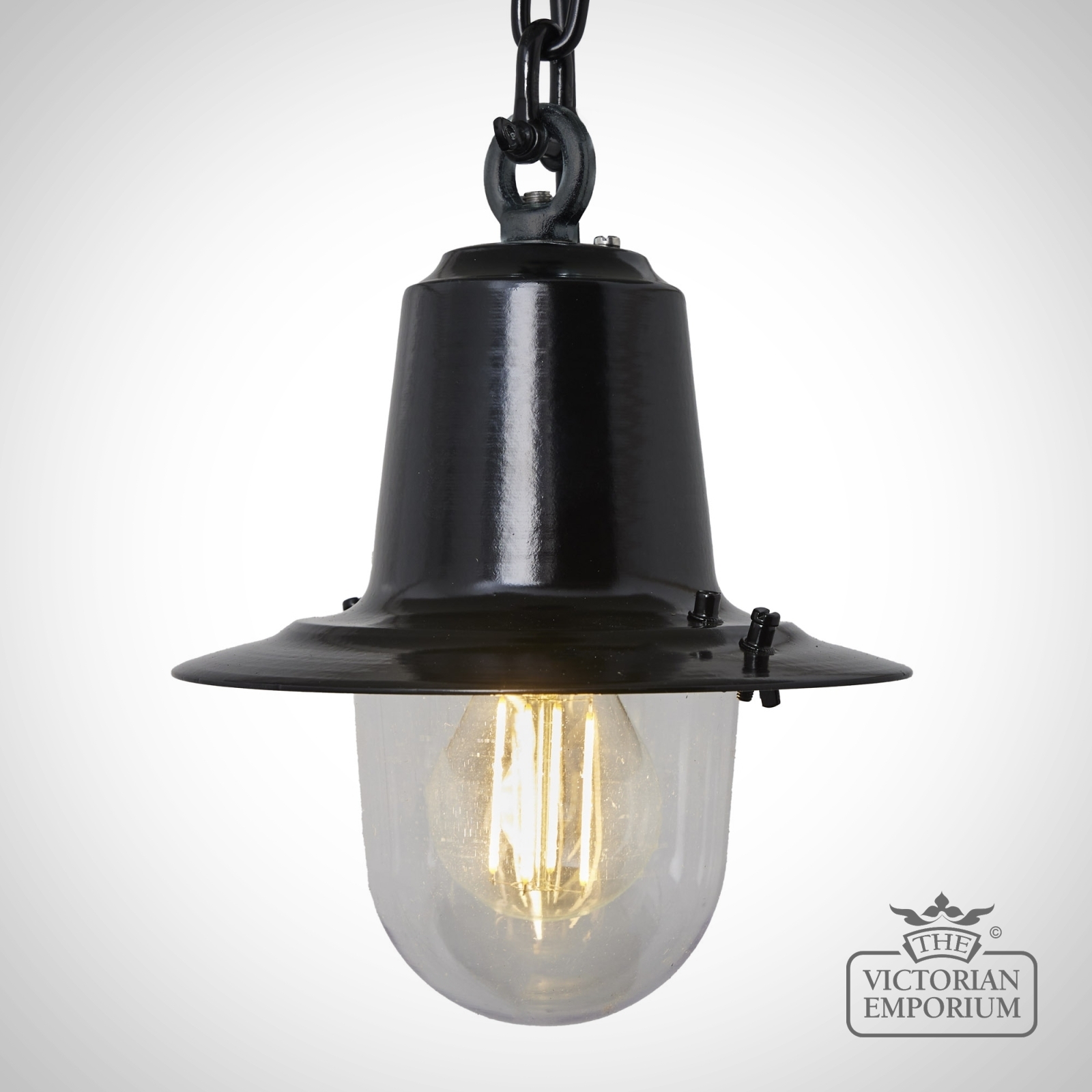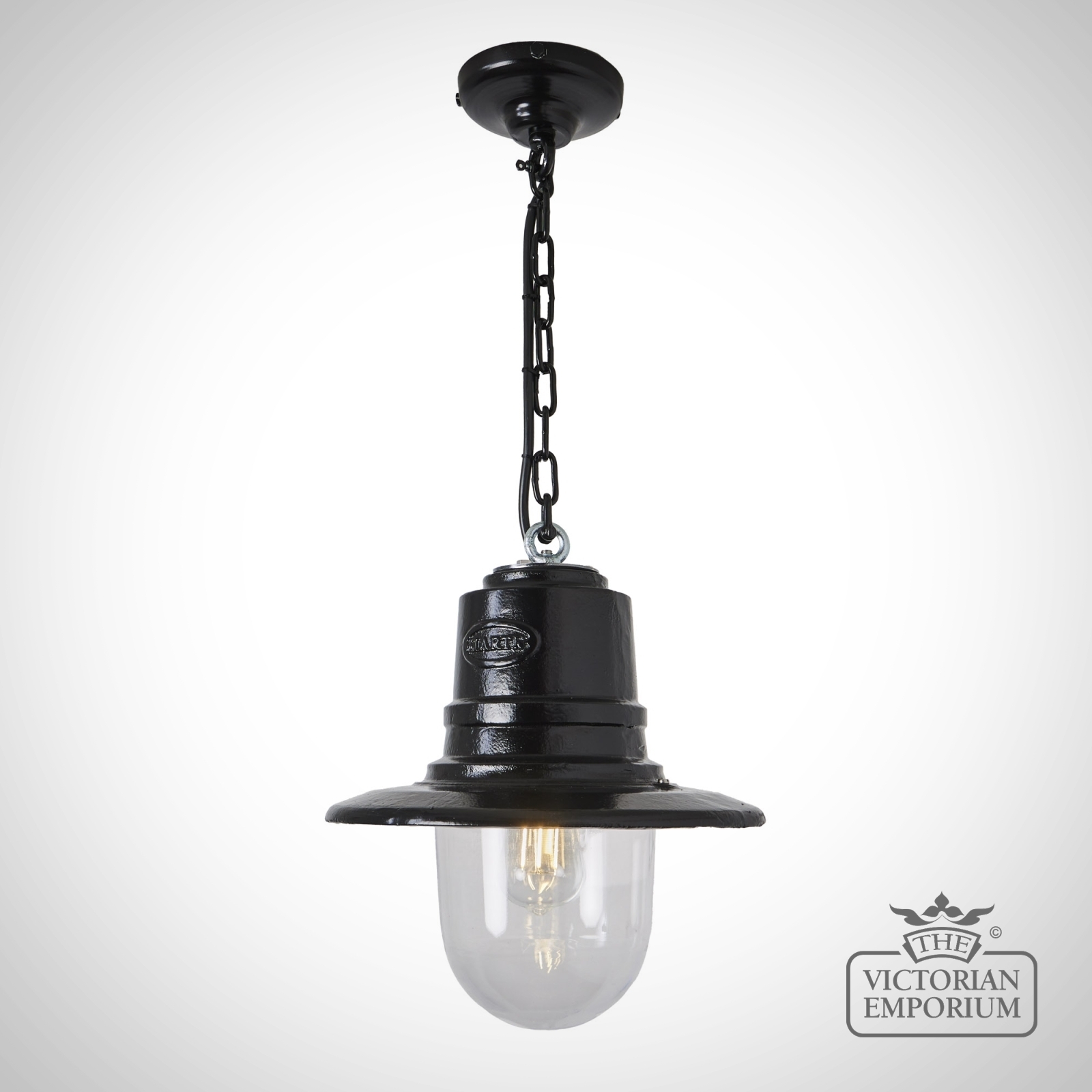 This is a traditional cast iron lantern in a really traditional Victorian Railway Inspired shape with the flexibility of 2 size options hung off a ceiling chain. Available in black or copper