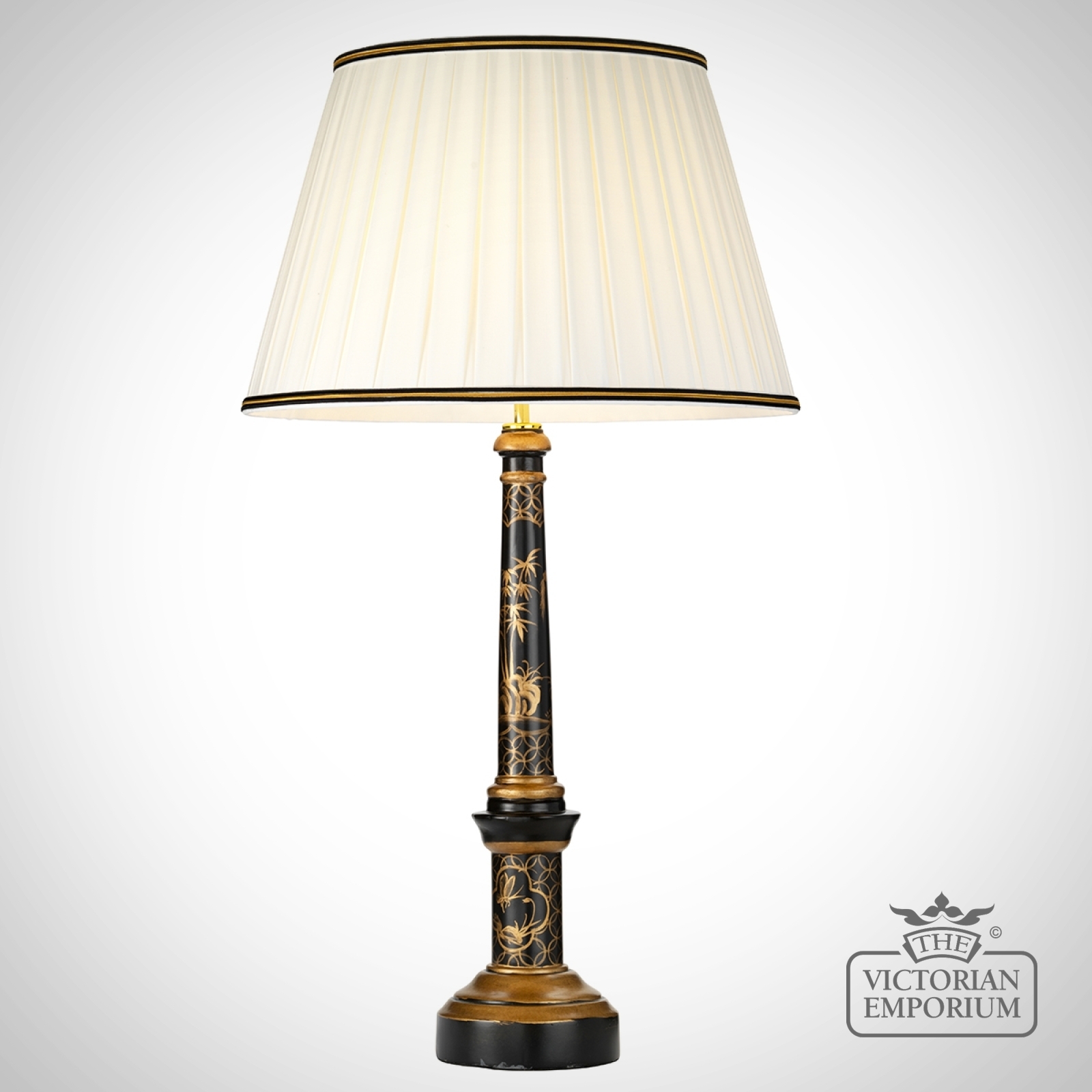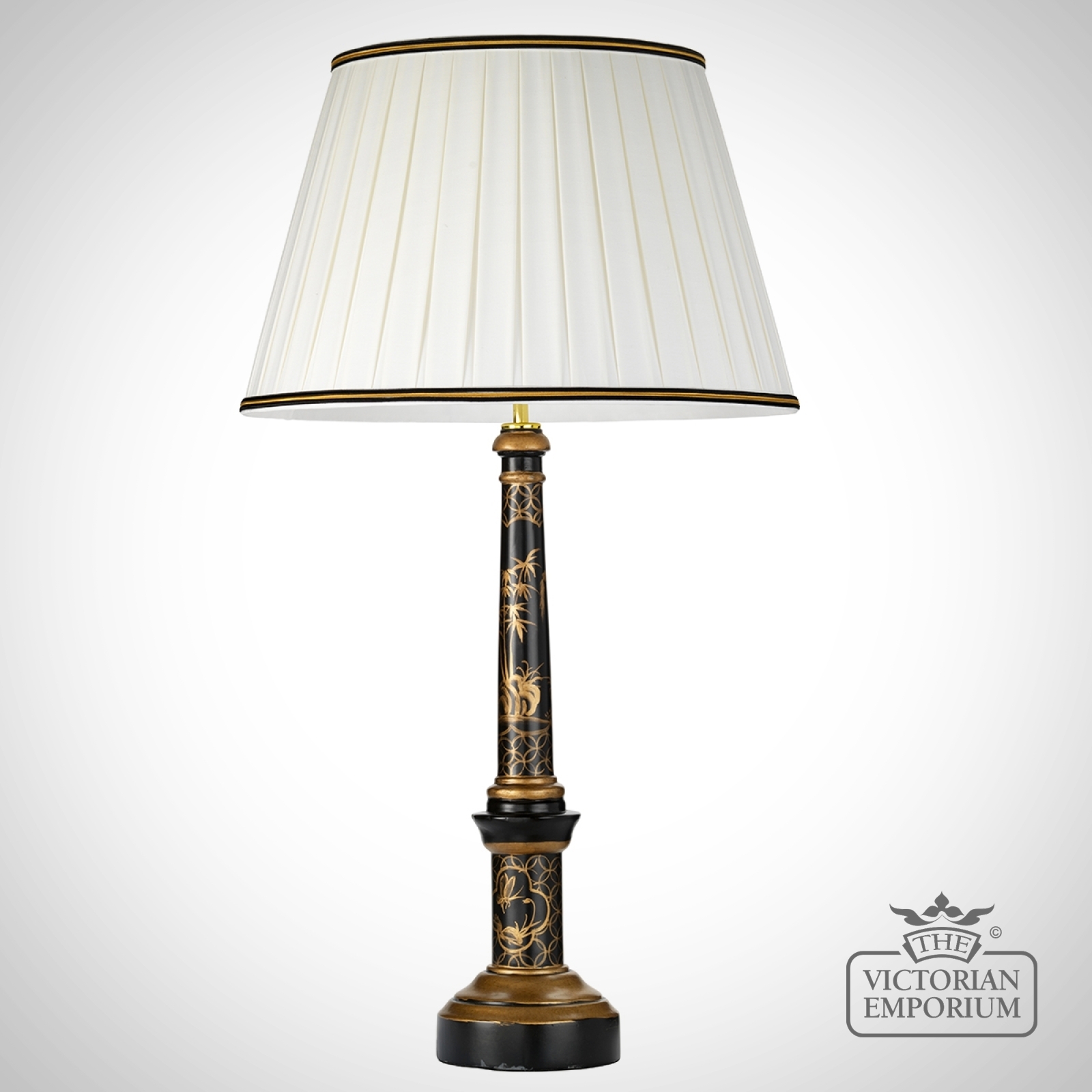 A Black decorated wood column base with gold painted accents. Completed with an Ivory 100% cotton, box pleat shade with black and gold trim.