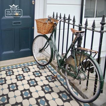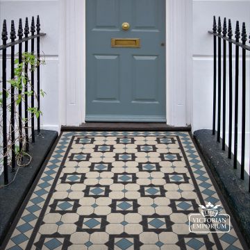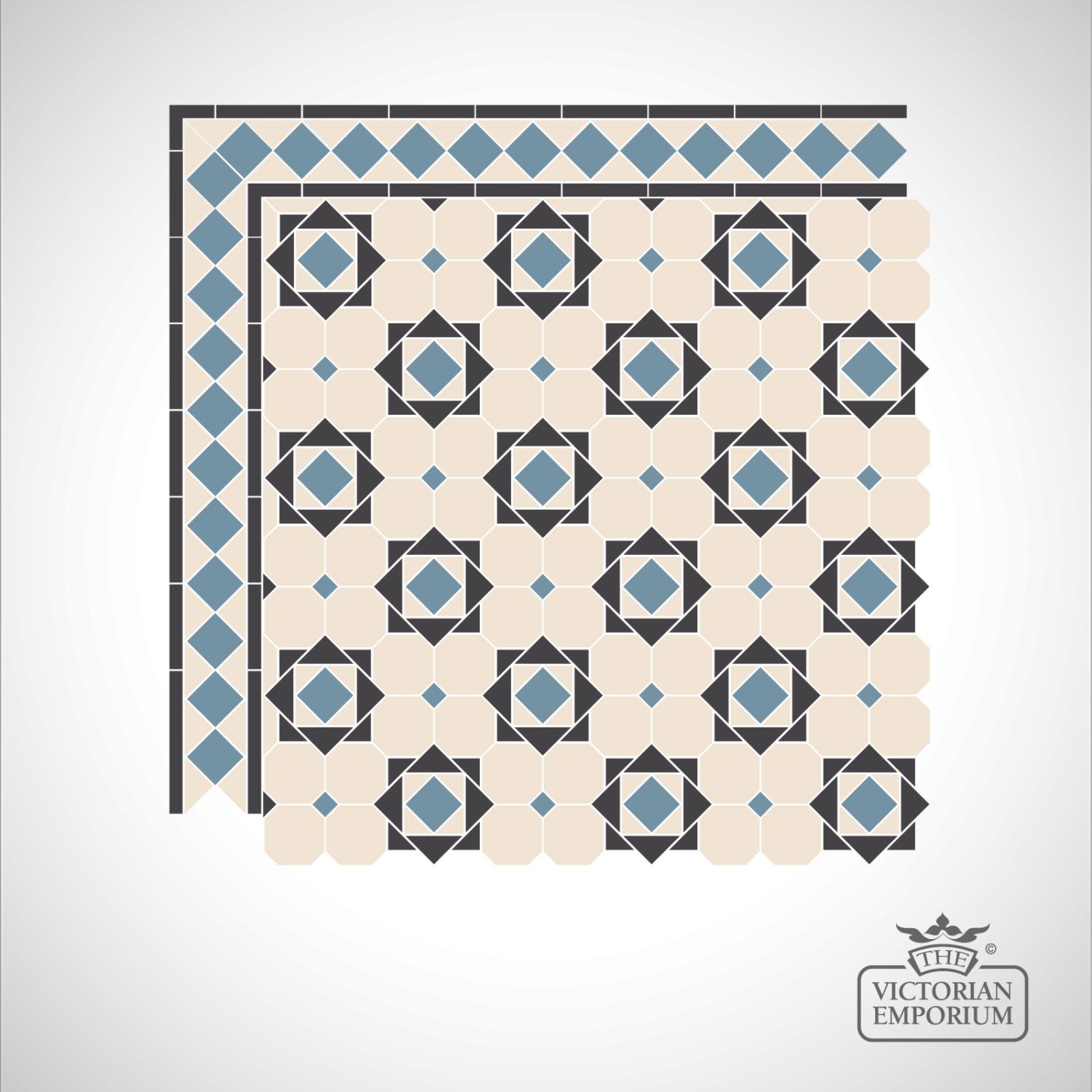 Victorian mosaic centre pattern tiles in a Victorian colour palette of blue, black and white - sold by the sheet.