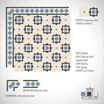 Strasbourg pattern inset tiles design matches Strasbourg Border and Corner tiles. On webbed sheets for fast and hassle free installation.