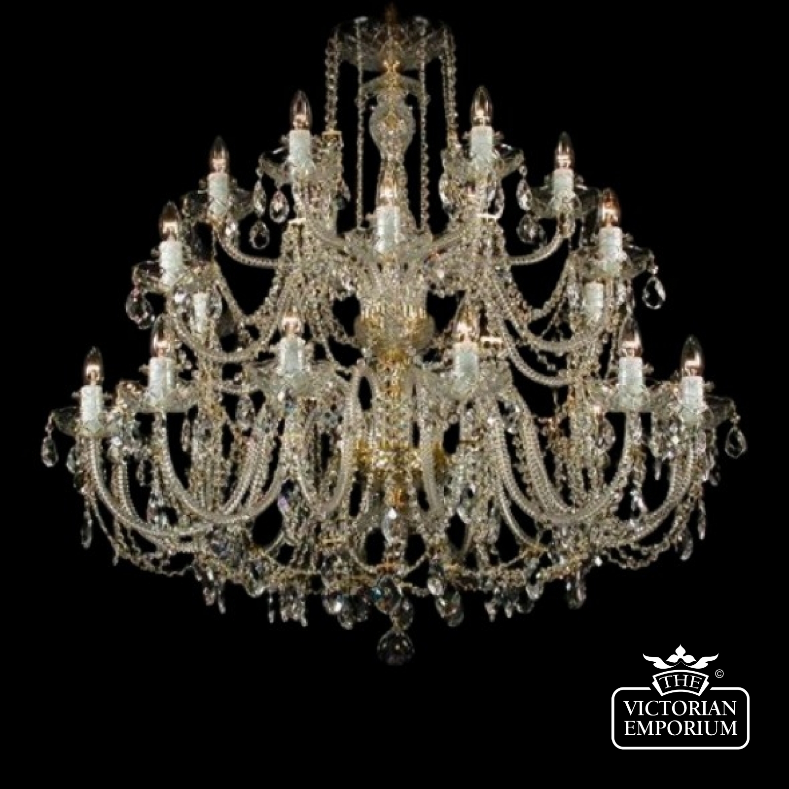 Suitable for hallways, large stairwells, galleried landings, large rooms with high ceilings. Laden with lead crystal trimmings which reflect with the light to produce colours of the spectrum.