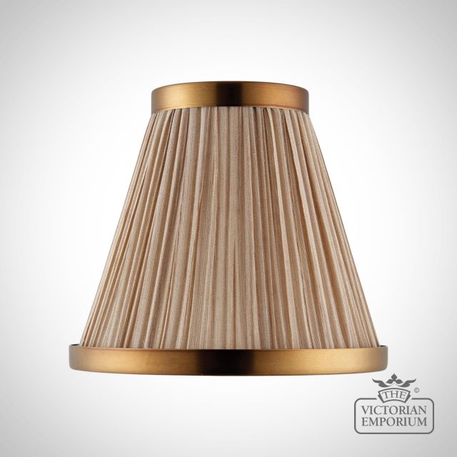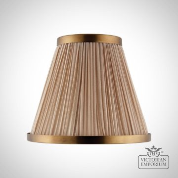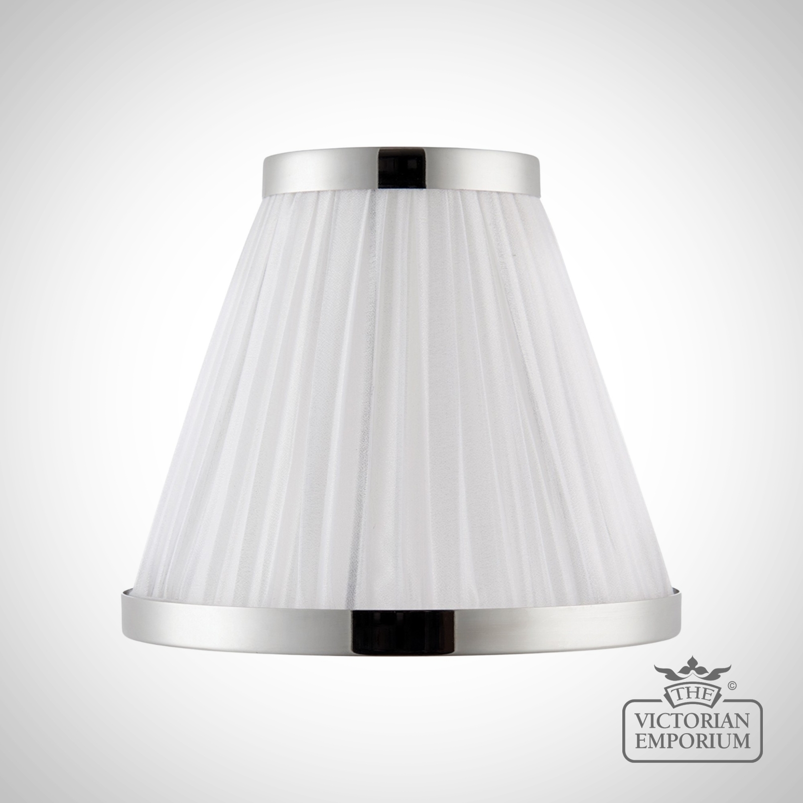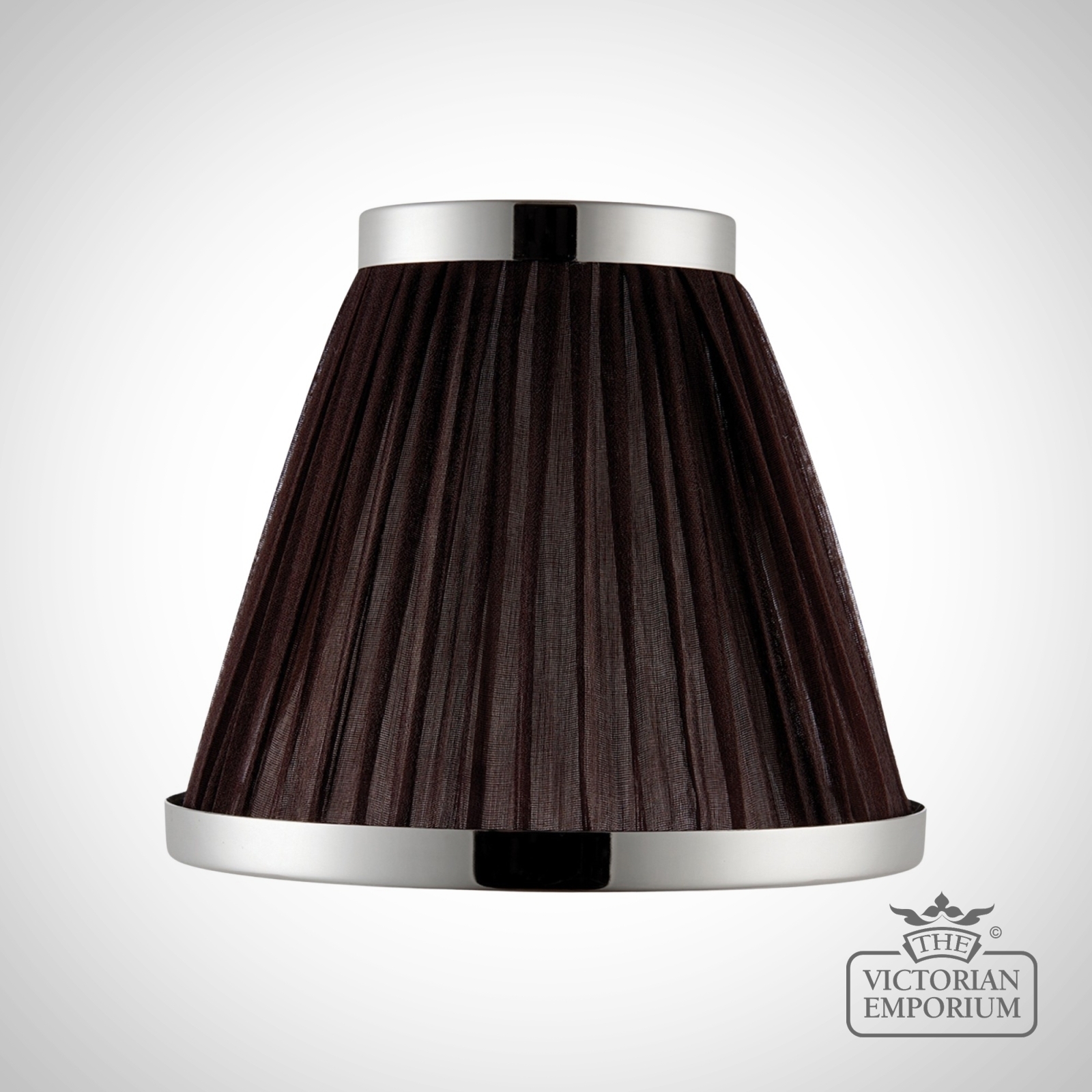 This 6 or 8 inch Suffolk lampshade is crafted from a beige, black, chocolate or white pleated organza effect fabric, with an antique brass or nickel trim