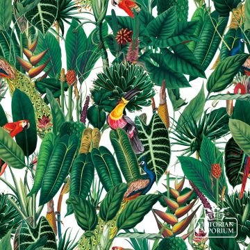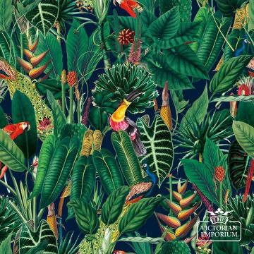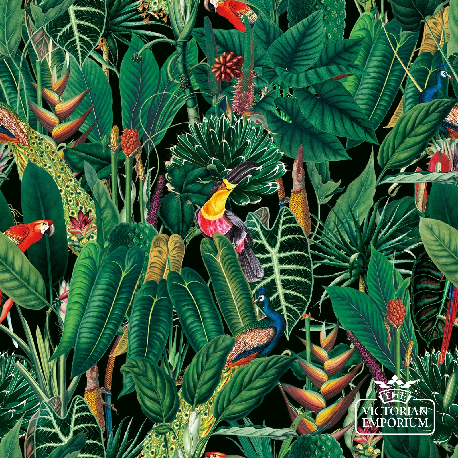 A really stunning fabric from the Tropical Velvets collection featuring exotic birds and rich green leafy plants in vibrant colours.