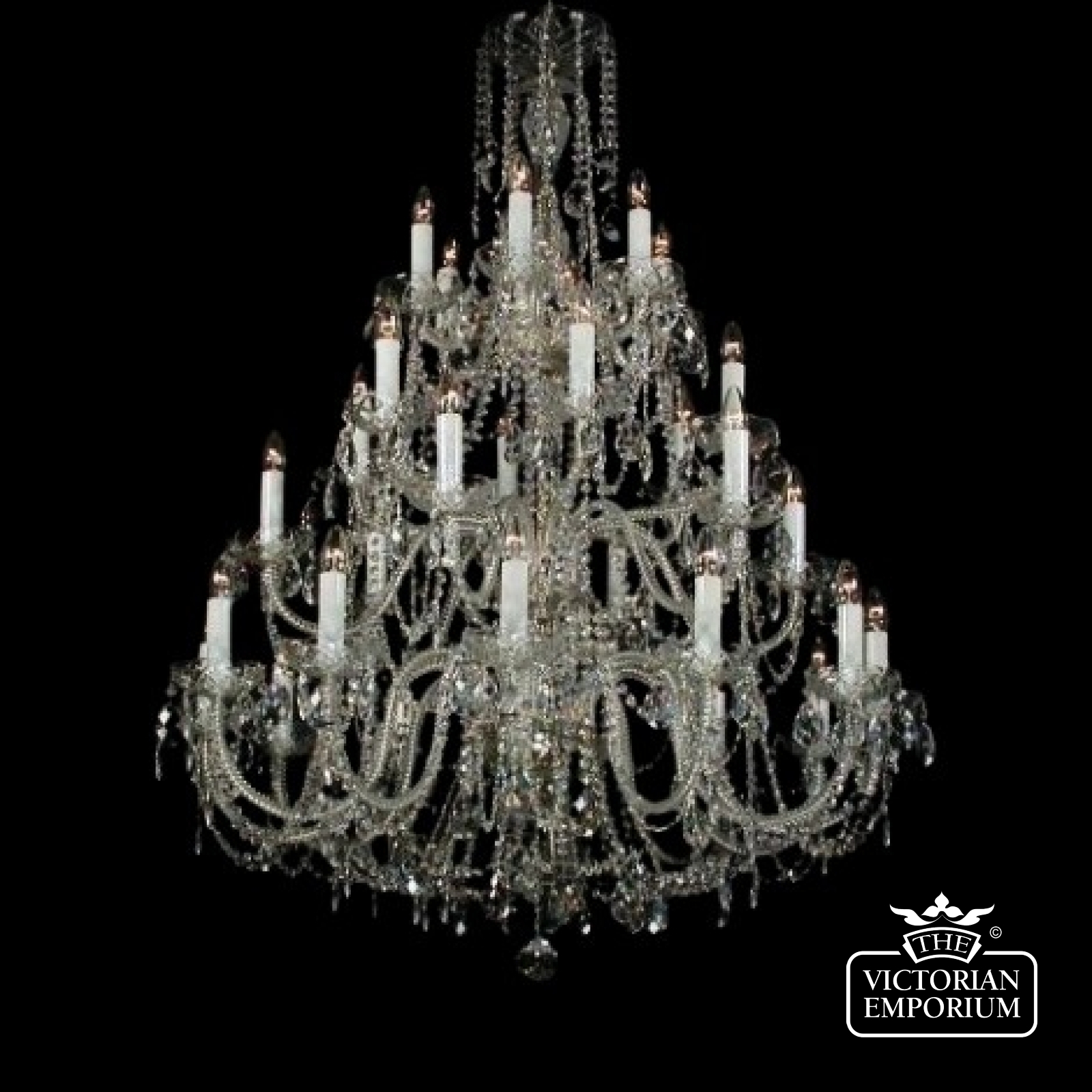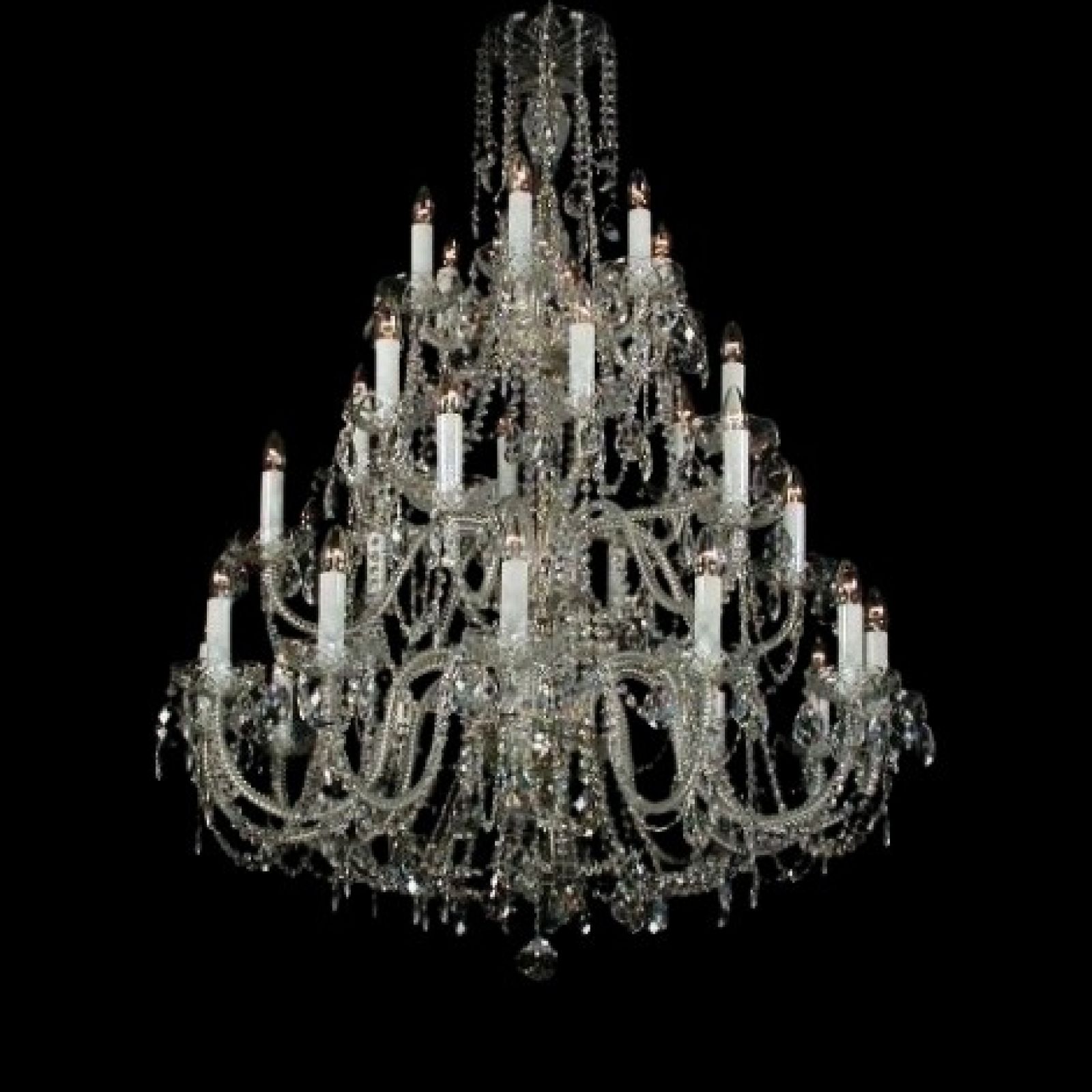 The crystal trimmings on our chandeliers are as follows: Exclusive Bohemian Crystal (Czech republic 30%PbO). The machine cut trimmings are characteristic with a brilliant polish and decompose the light beams in a light spectrum. Preciosa crystal (Czech republic 30%PbO).