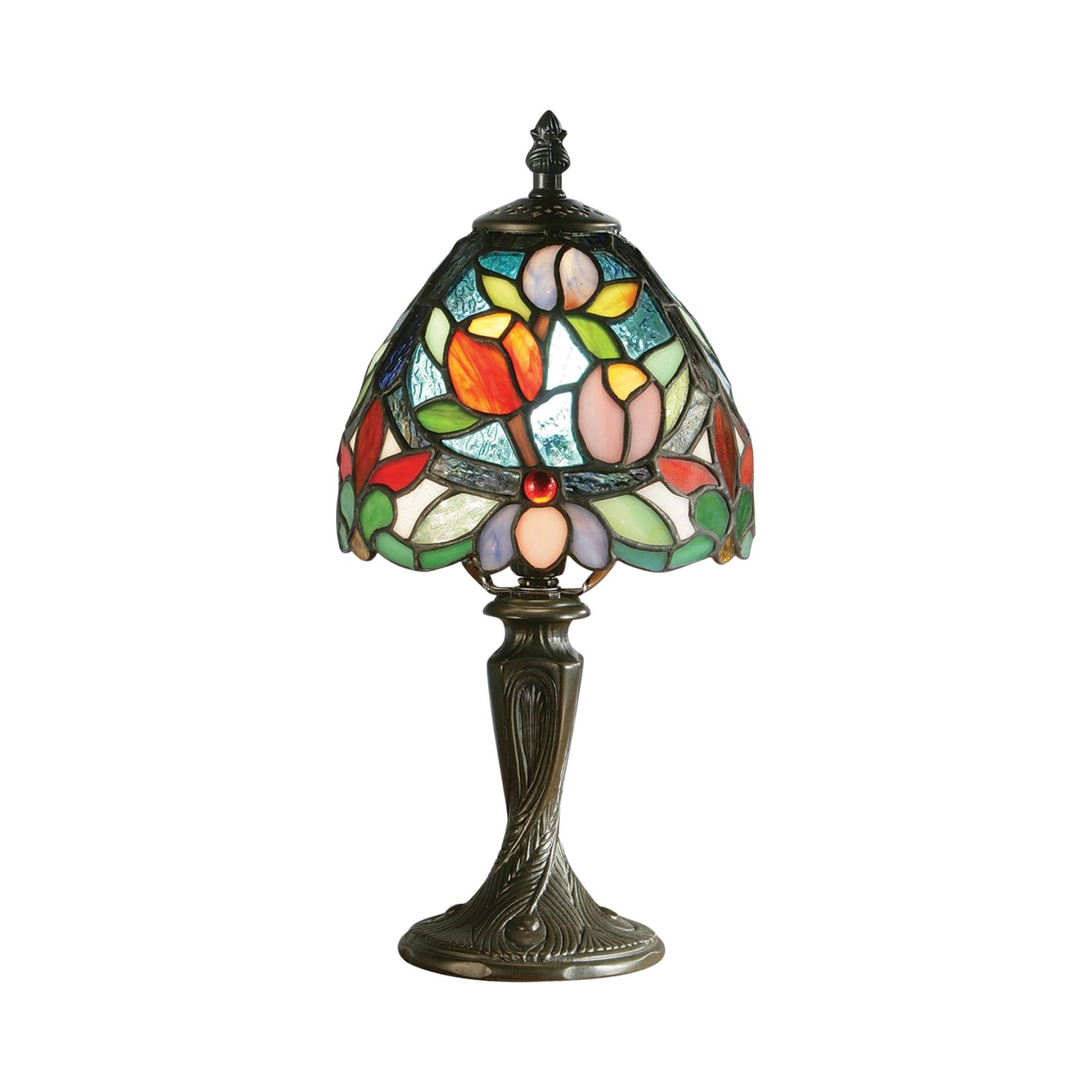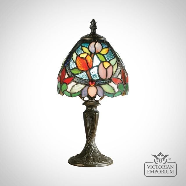 A mini lamp featuring the traditional dark bronze effect base, and brightly coloured tiffany style glass