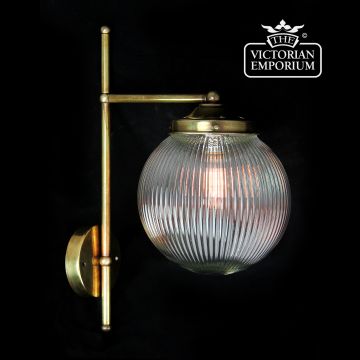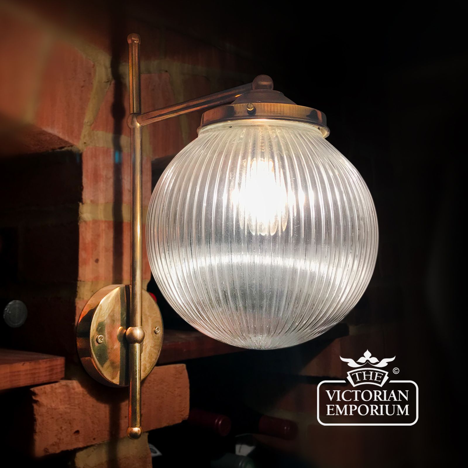 T Bracket Single Globe Wall Light - featuring a prismatic reeded glass shade and a distressed brass finished bracket