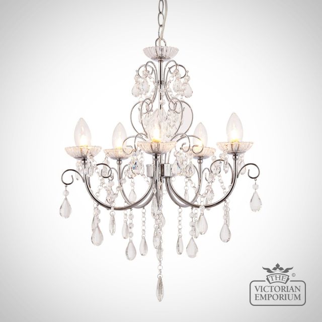The Tabitha 5 light ceiling pendant is finished in a chrome effect plate with clear crystal glass detail and droplets. It’s also IP44 rated