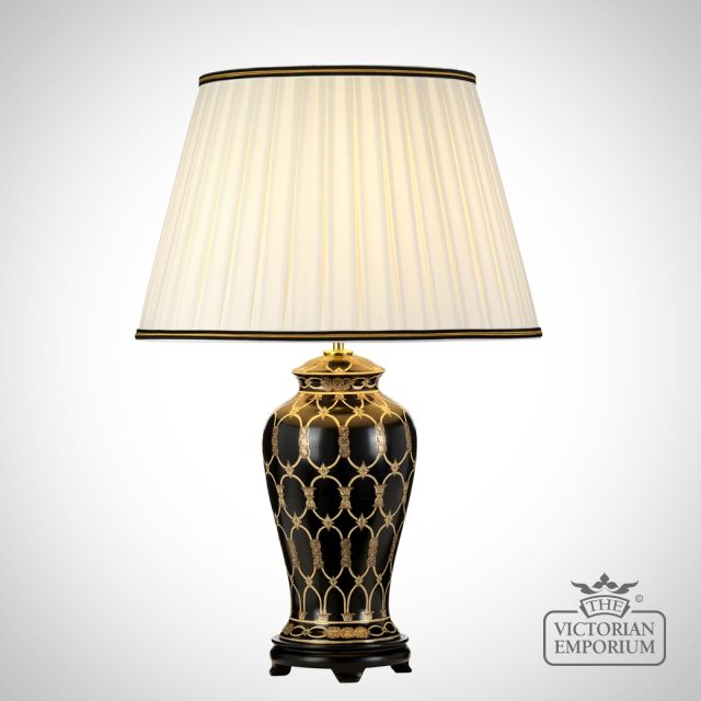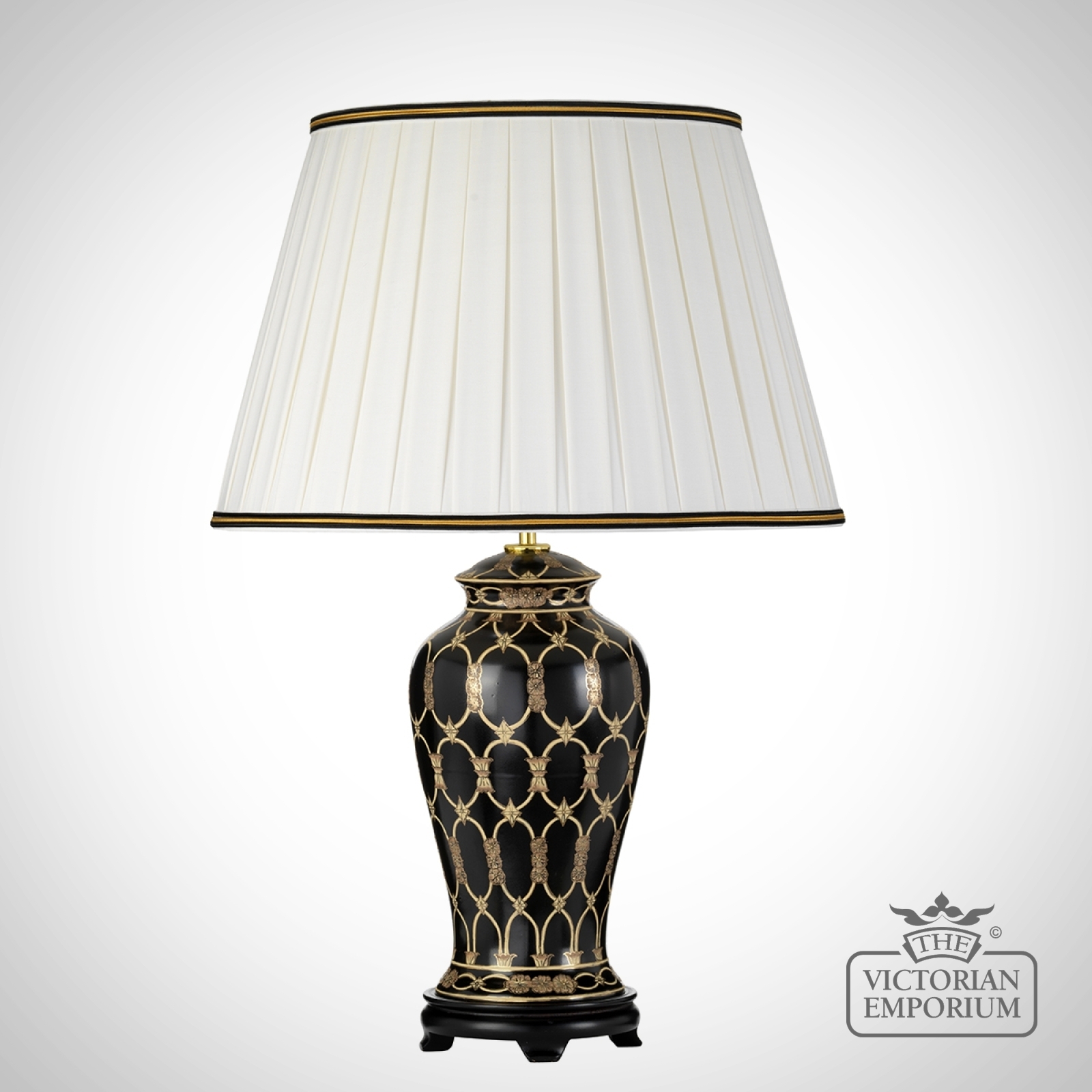 A traditional Black oriental ceramic vase table lamp with gold and brown décor. Including an Ivory 100% cotton, box pleat shade with black and gold trim.