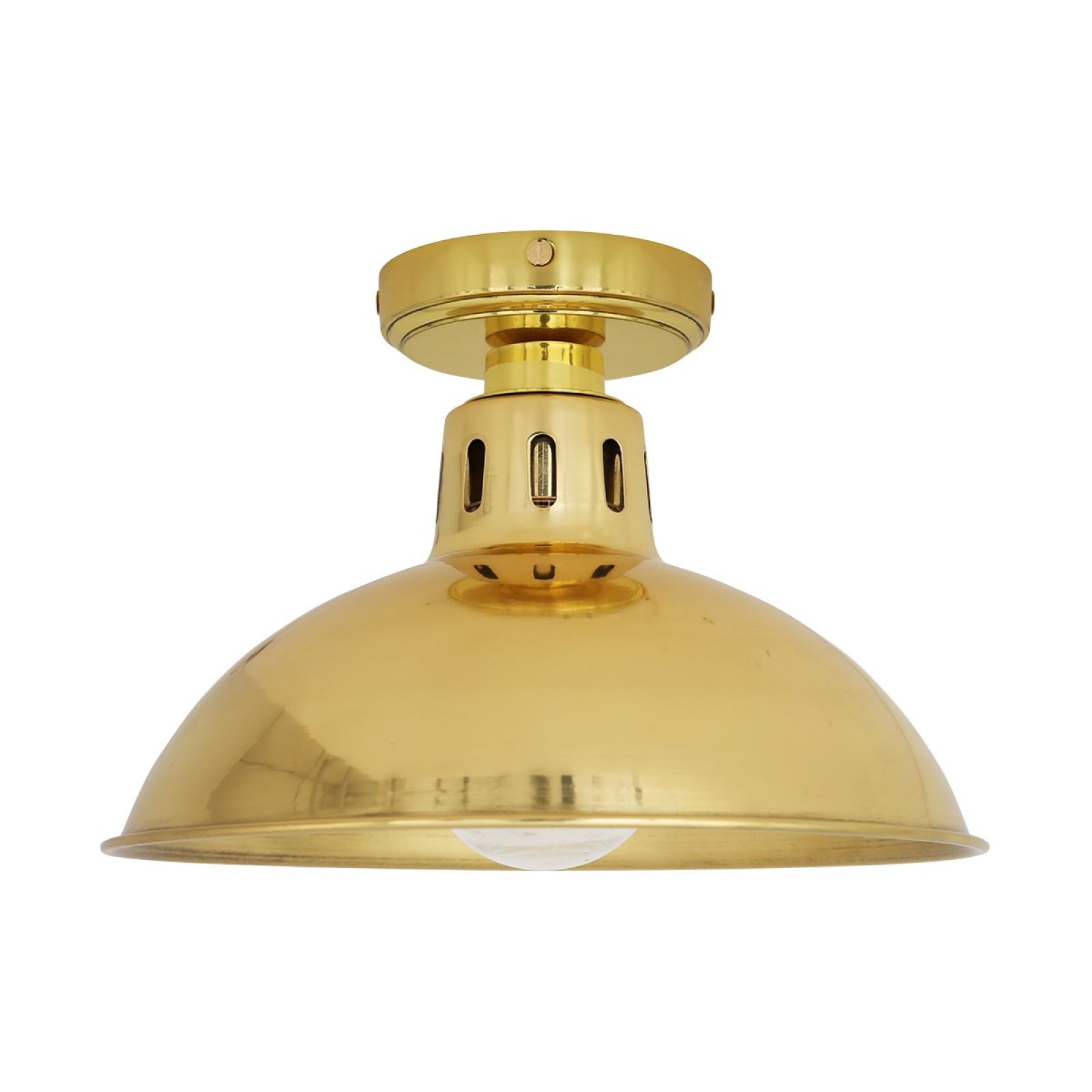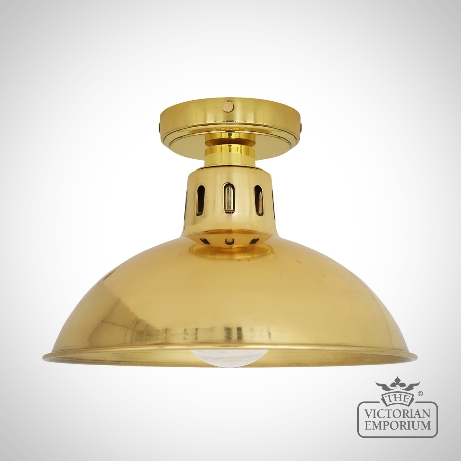 The Talisa ceiling light is a vintage-style flush ceiling light featuring a brass dome shade attached to a brass lamp holder and ceiling rose with a teardrop-shaped glass shade with LED tube light inside a waterproof enclosure