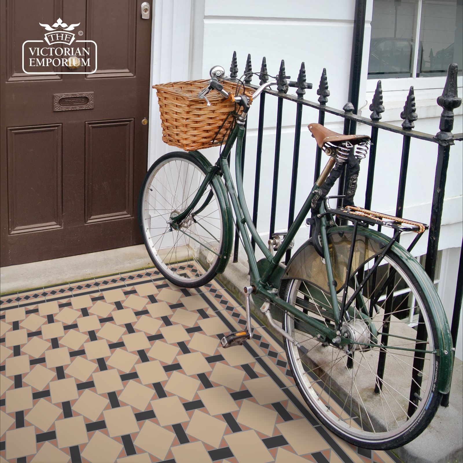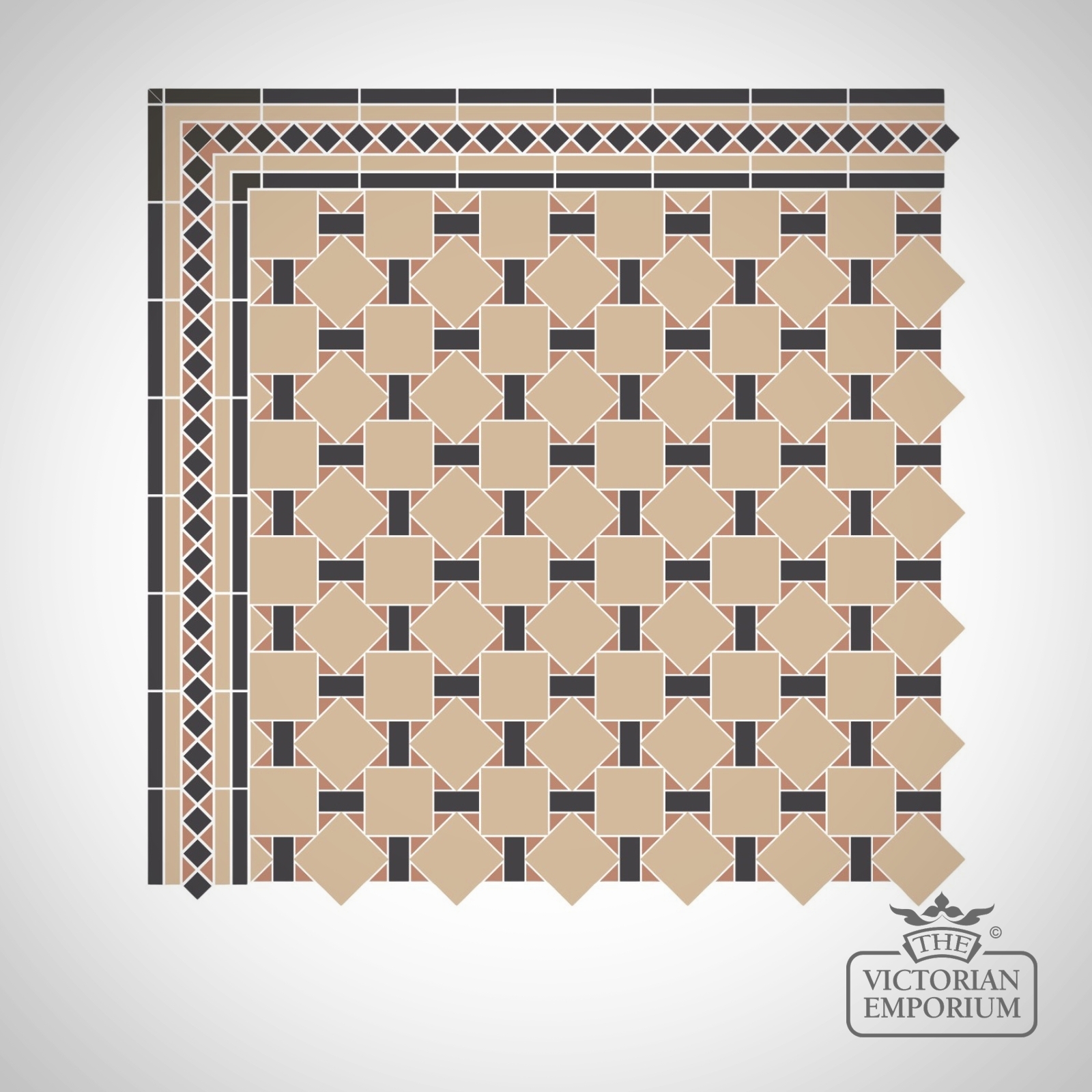 Victorian mosaic centre pattern tiles in a Victorian colour palette of black, buff and rust - sold by the sheet.