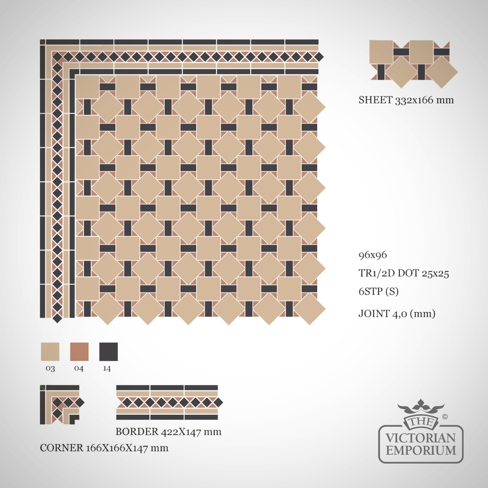 Tallinnn pattern inset tiles design matches Tallinnn Border and Corner tiles. On webbed sheets for fast and hassle free installation.