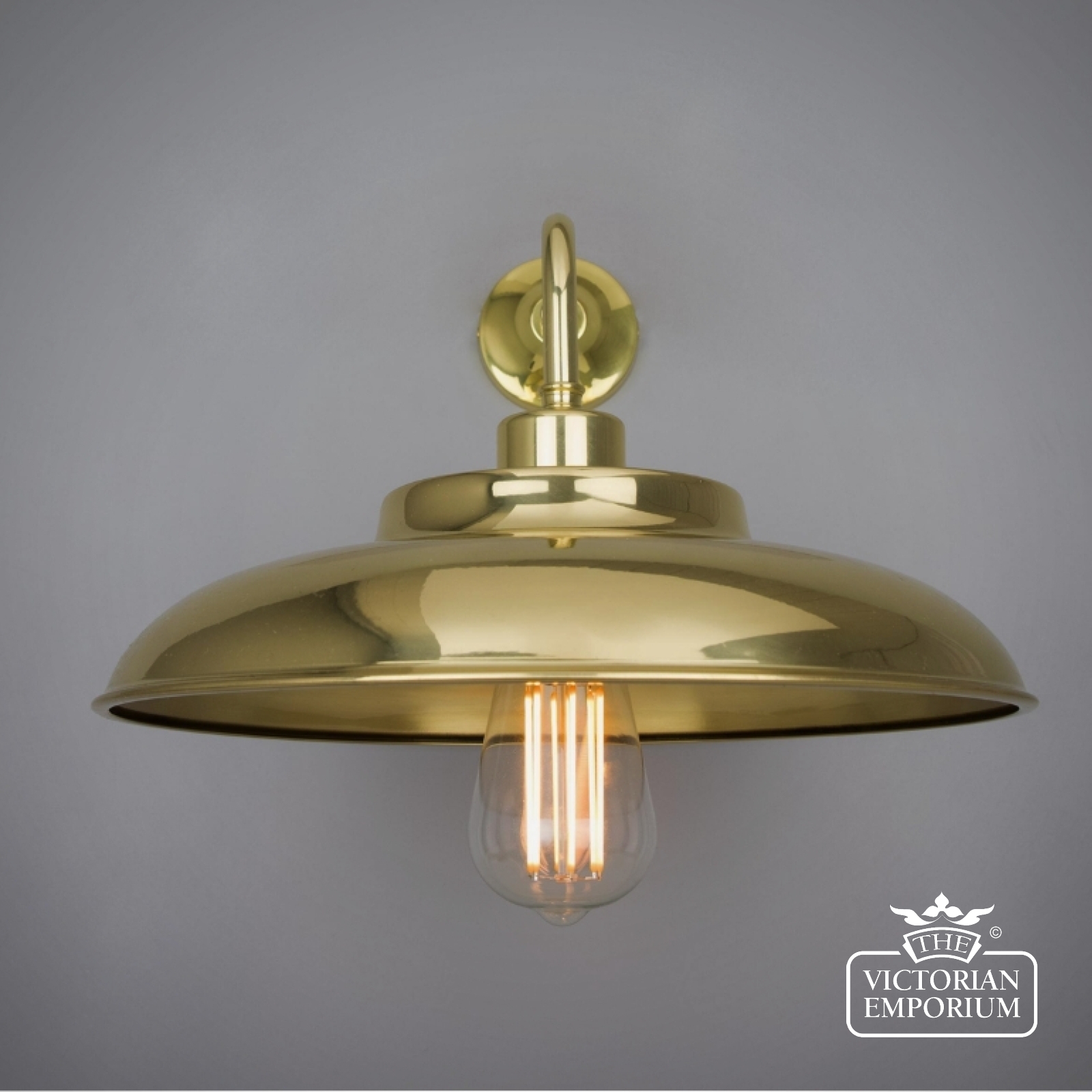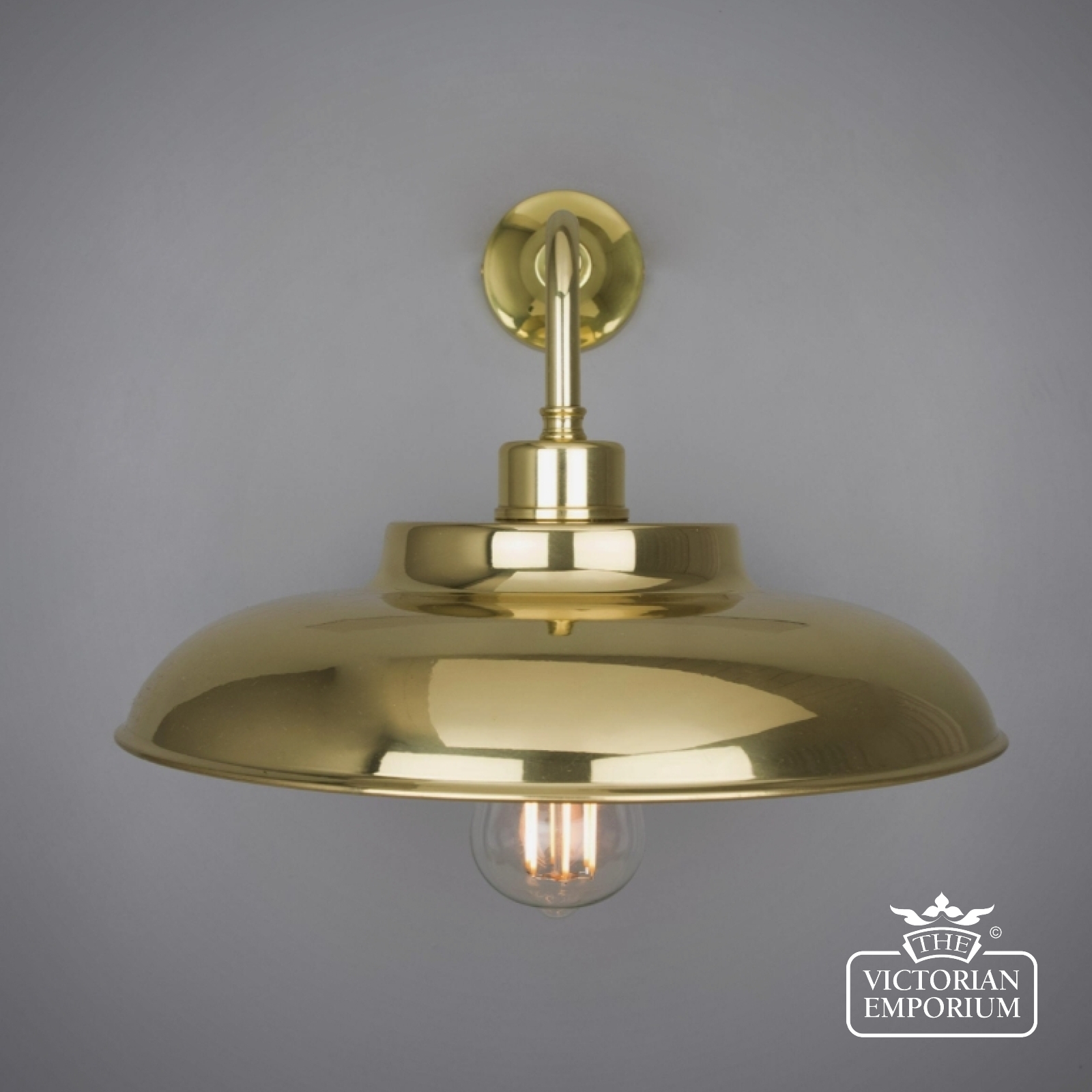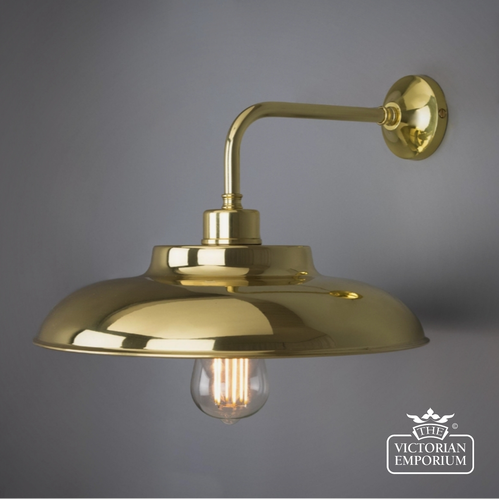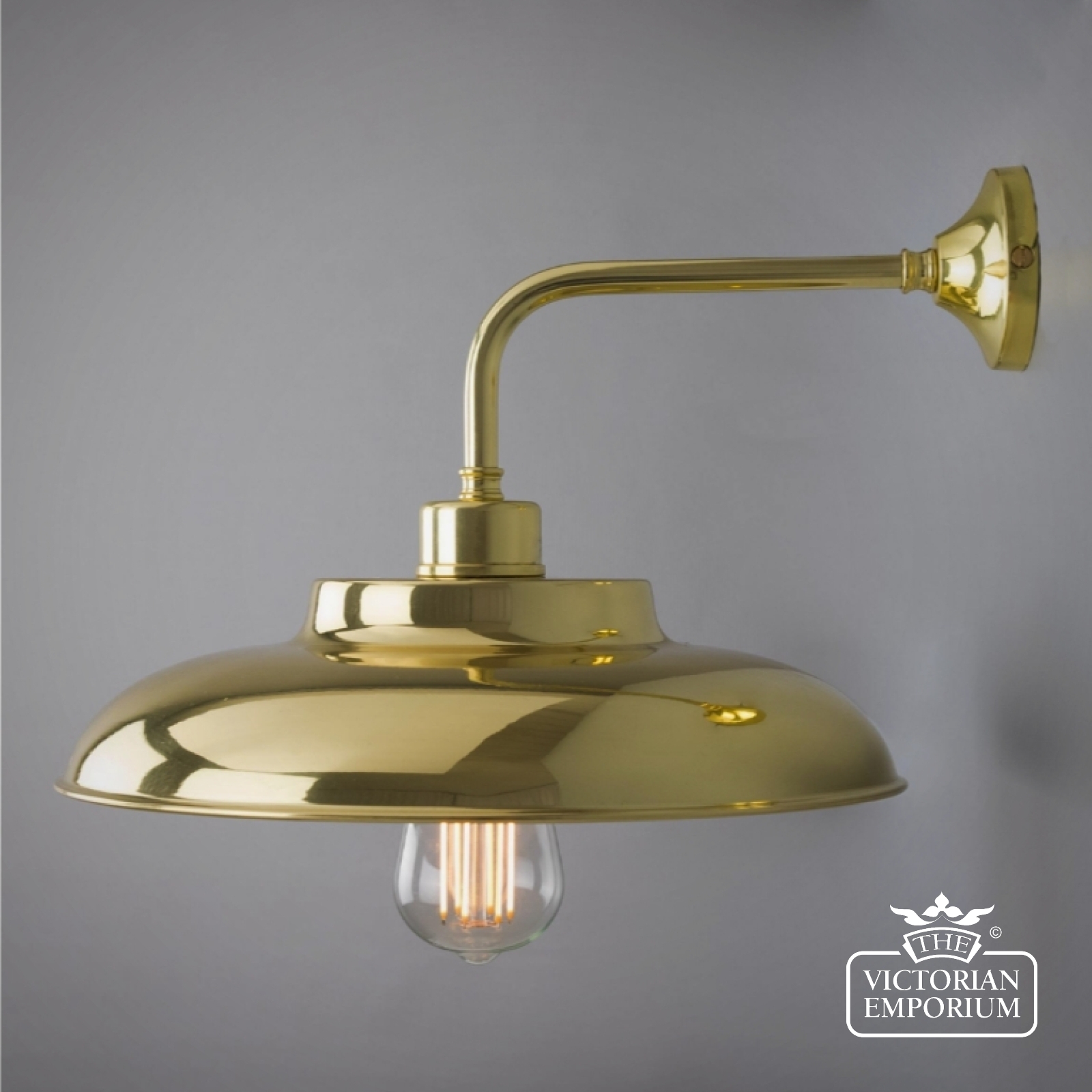 The Tela wall light has a factory lamp shade with an exposed bulb that disperses light over a large area. The wall bracket has an elegant L-shaped brass arm.