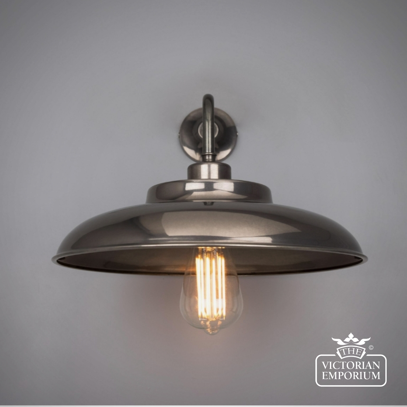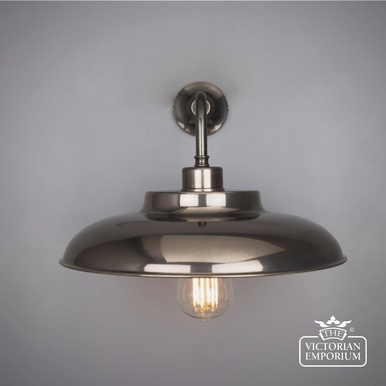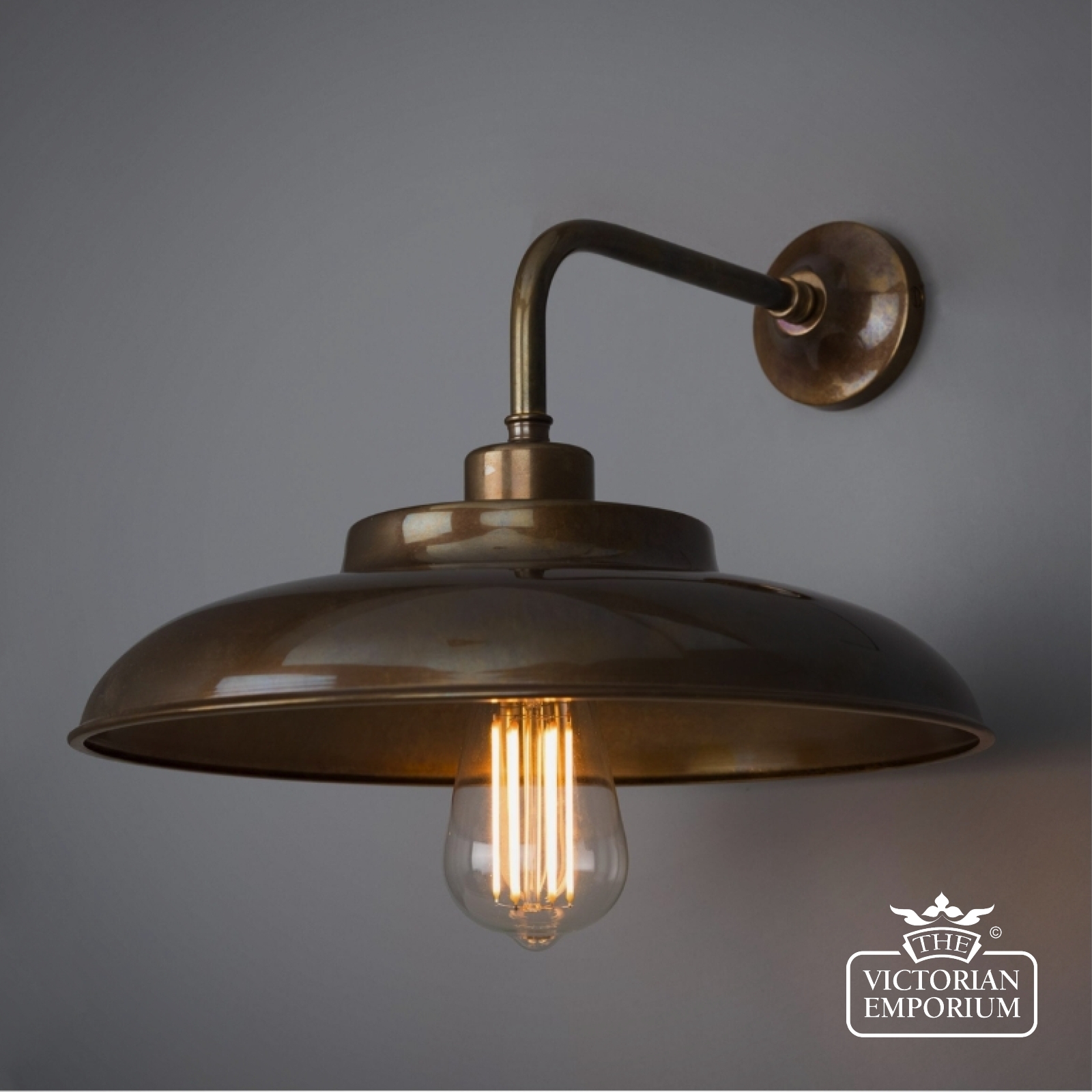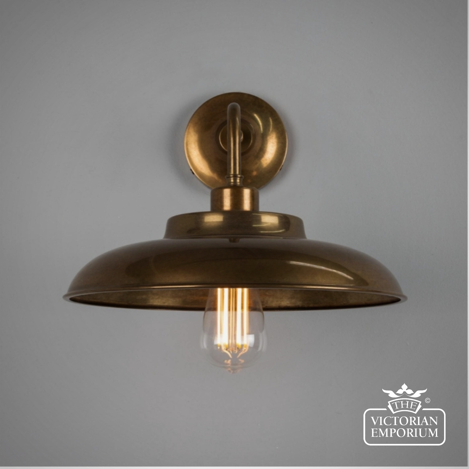 The Tela wall light has a factory lamp shade with an exposed bulb that disperses light over a large area. The wall bracket has an elegant L-shaped brass arm.