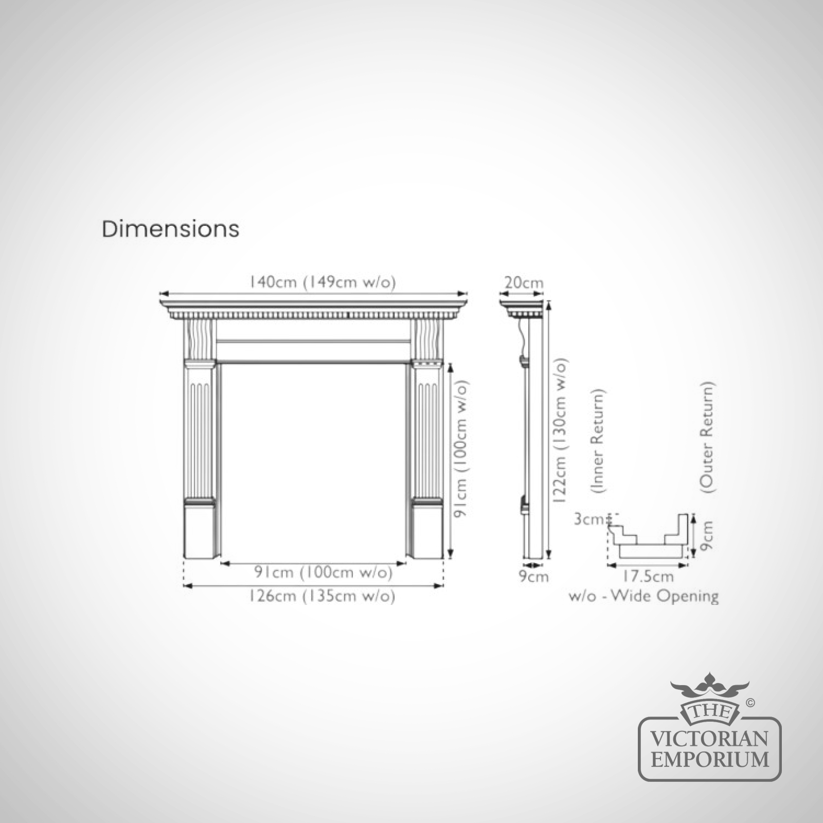 The Corbel is a classic fireplace surround in a Georgian style in a choice of woods and finishes. Corbels separate columns with three vertical curved indentations from a repeated-square pattern that stretches beneath the broad mantel.