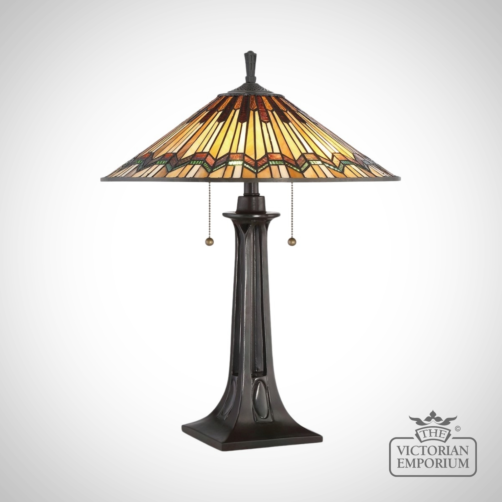 About this Tiffany style light: This lamp design features soft green, amber and cream glass pieces. The lamp base is finished in bronze