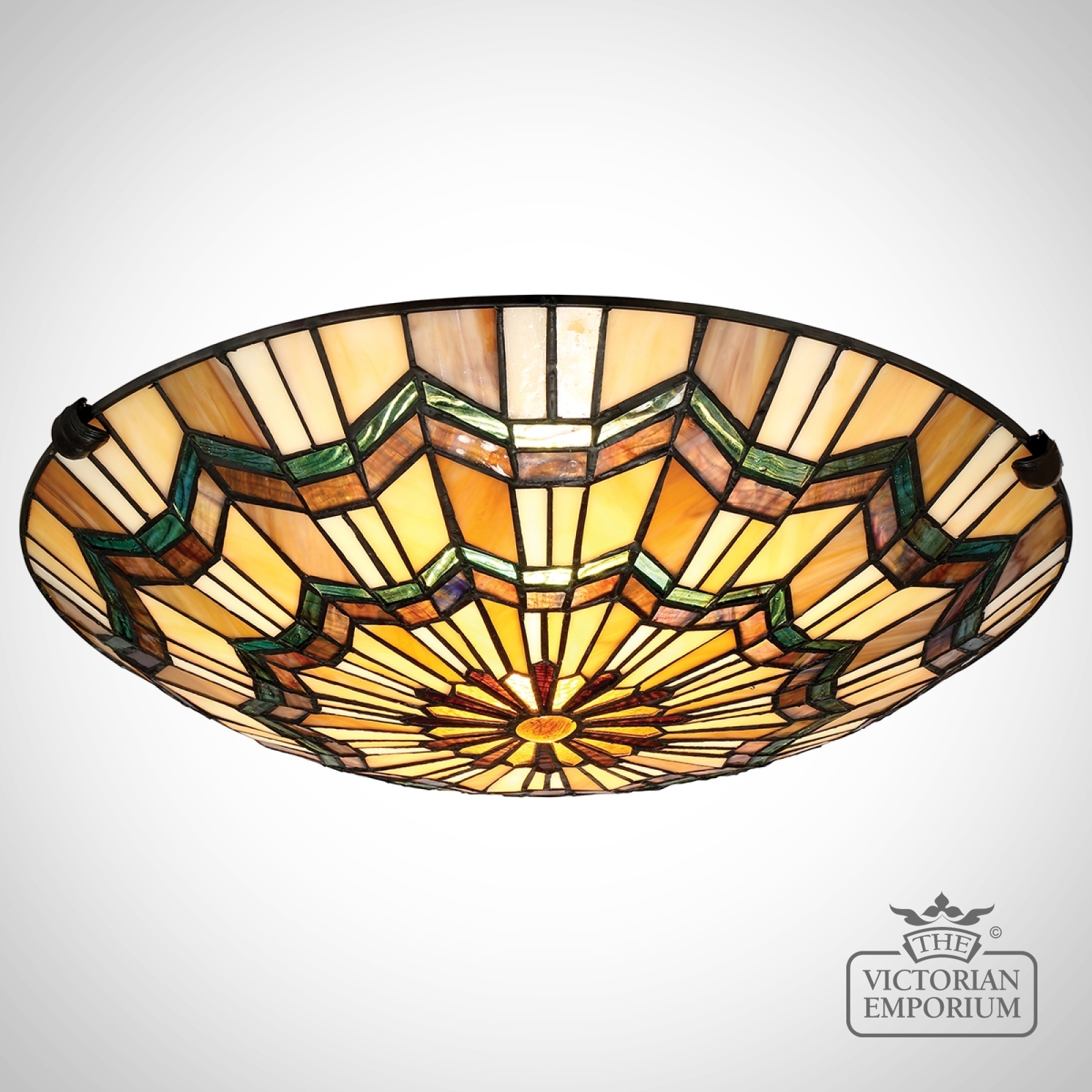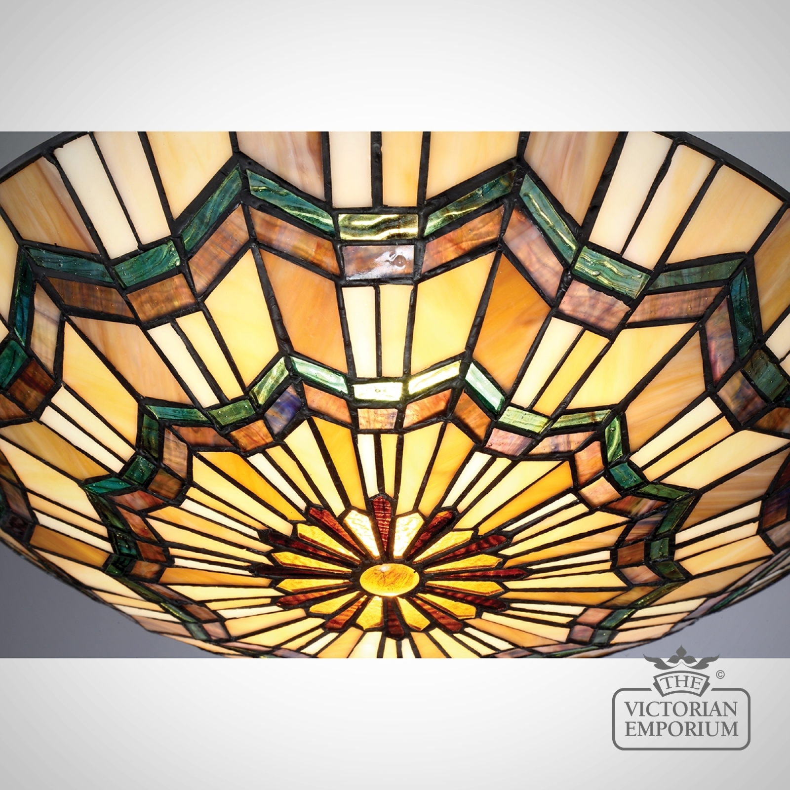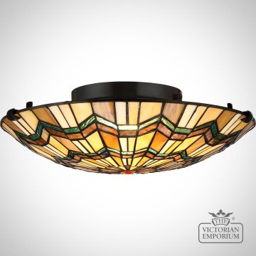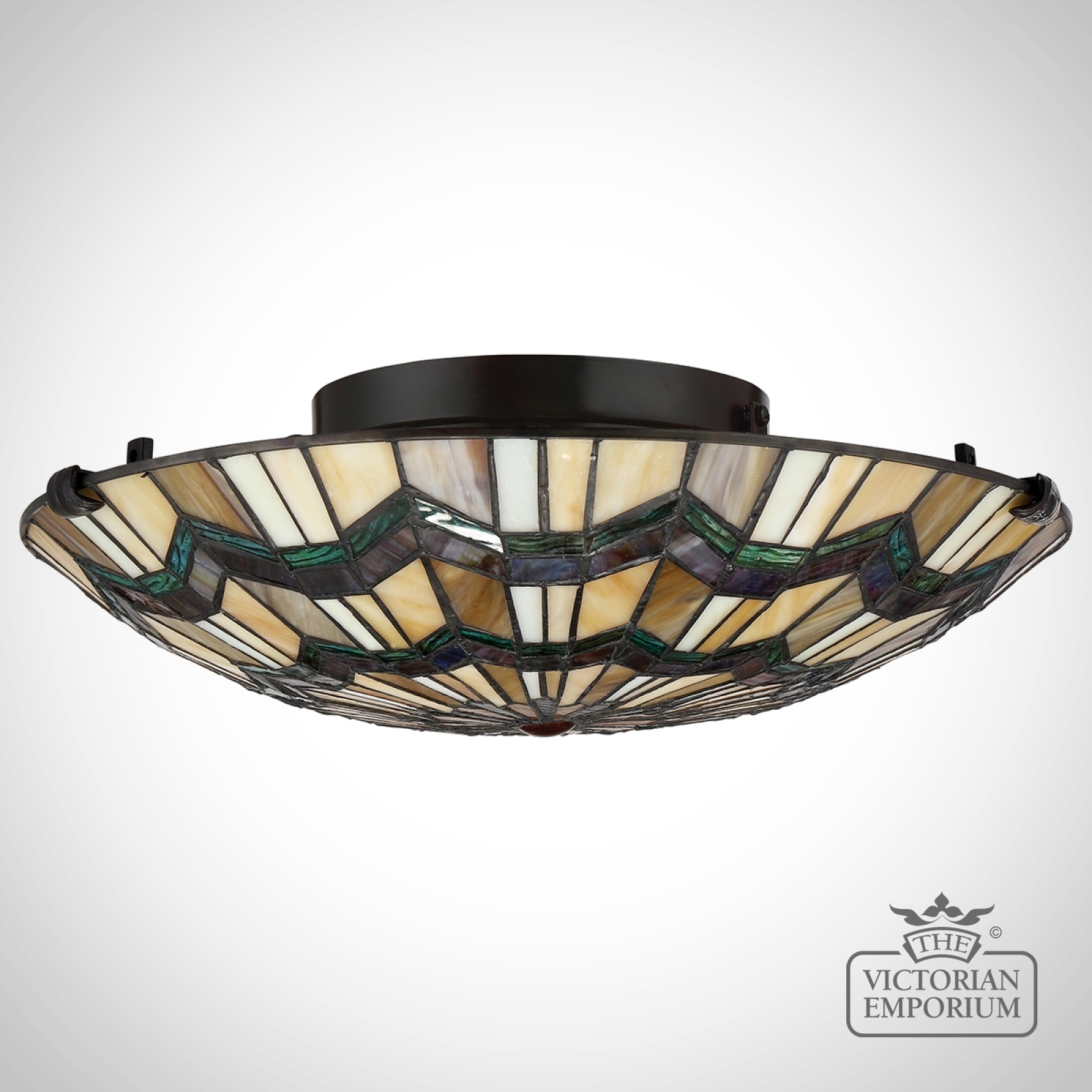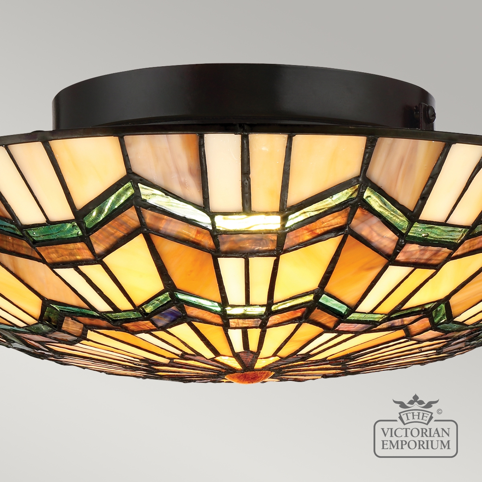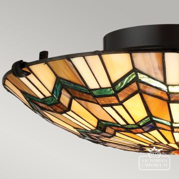 This flush mount design features a soft green, amber and cream glass pieces. The structure is finished in bronze