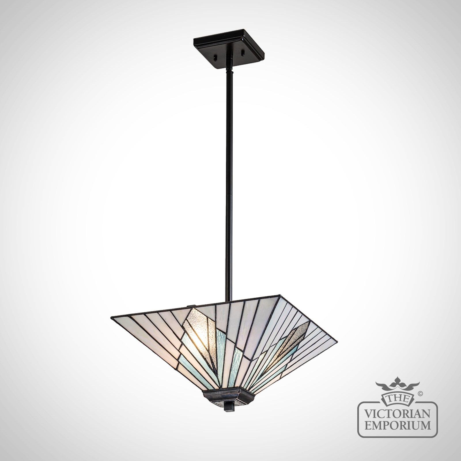The Alderley ceiling uplighter has a triangular shade with a typical Tiffany design with subtle muted colours