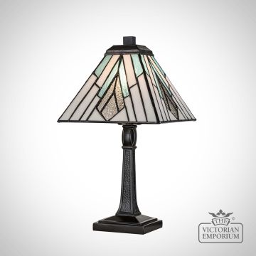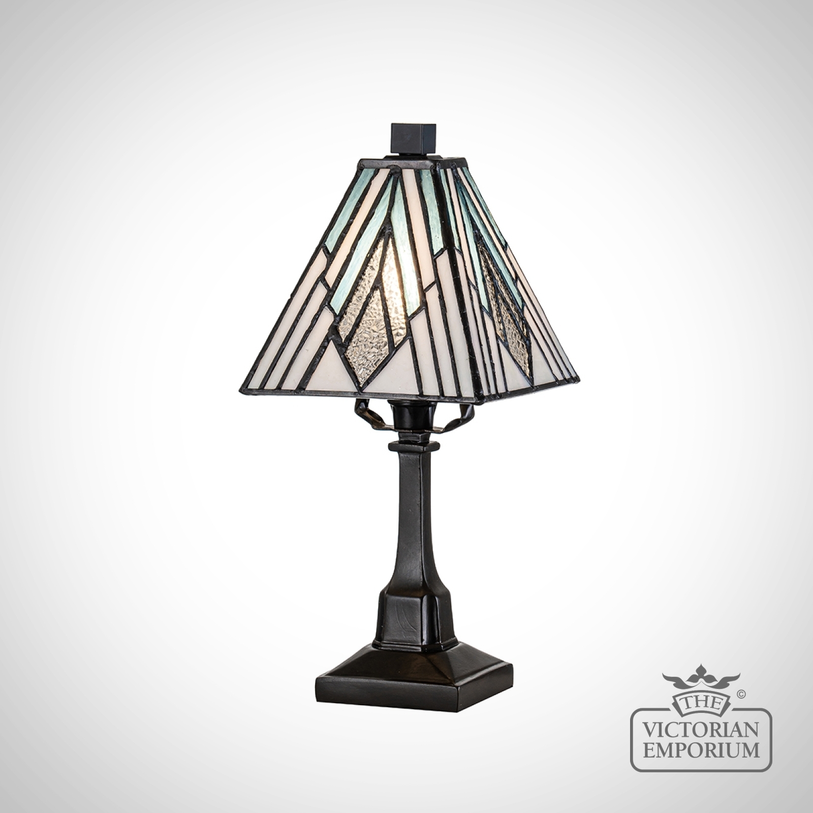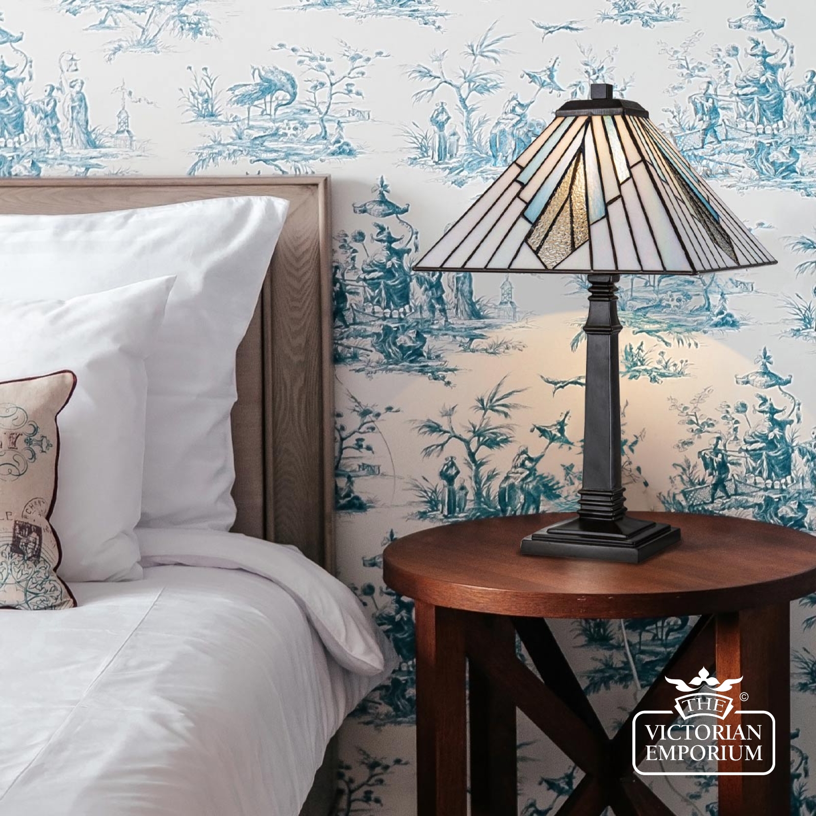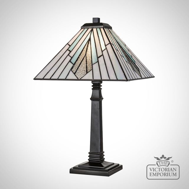 The Alderley table light has a triangular shade and a simple arm and classic square base. It’s a typical Tiffany design with subtle muted colours
