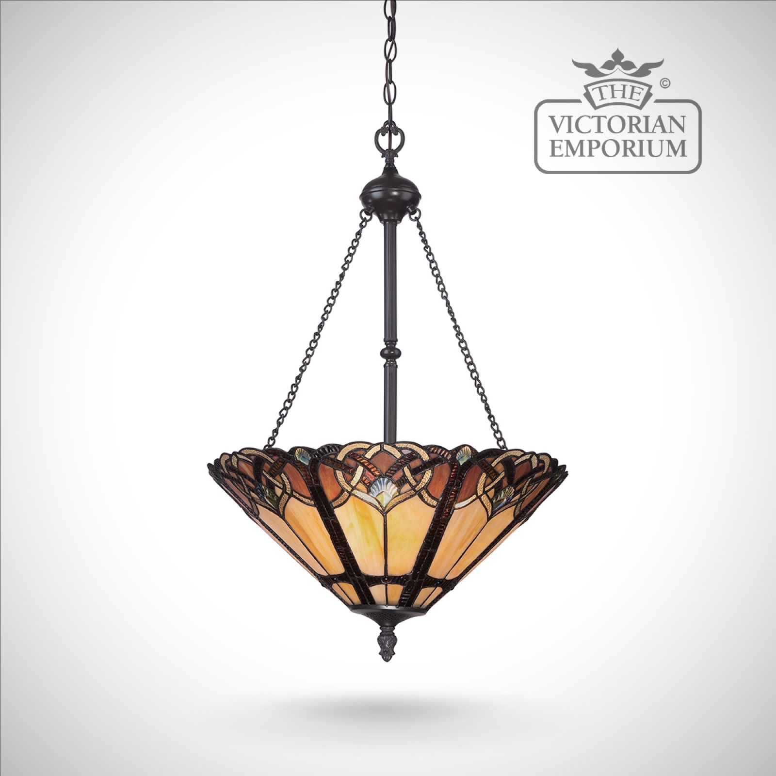 About this Tiffany style light: The beautiful Cambridge pendant has a vibrant colour palette of beiges, oranges and soft green in an Art Nouveau pattern. The rich vintage bronze finish makes this is lovely fitting
