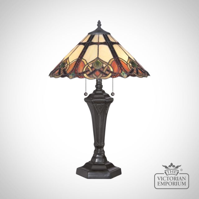 About this Tiffany style light: The Cambridge table lamp has a vibrant colour palette of beiges, oranges and soft green in an Art Nouveau pattern. The rich vintage bronze finish makes this a lovely fitting