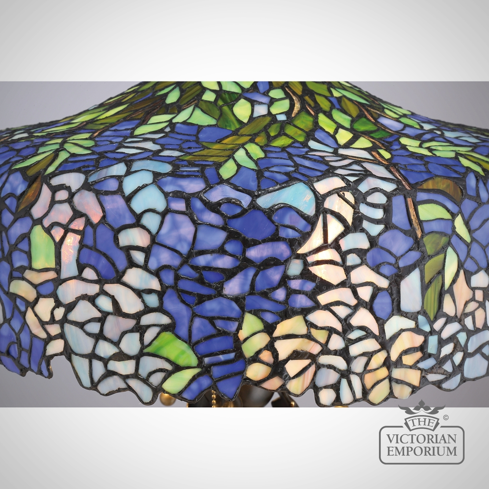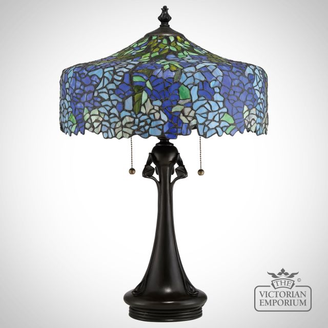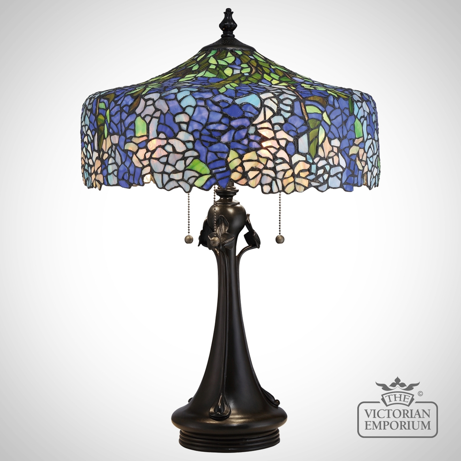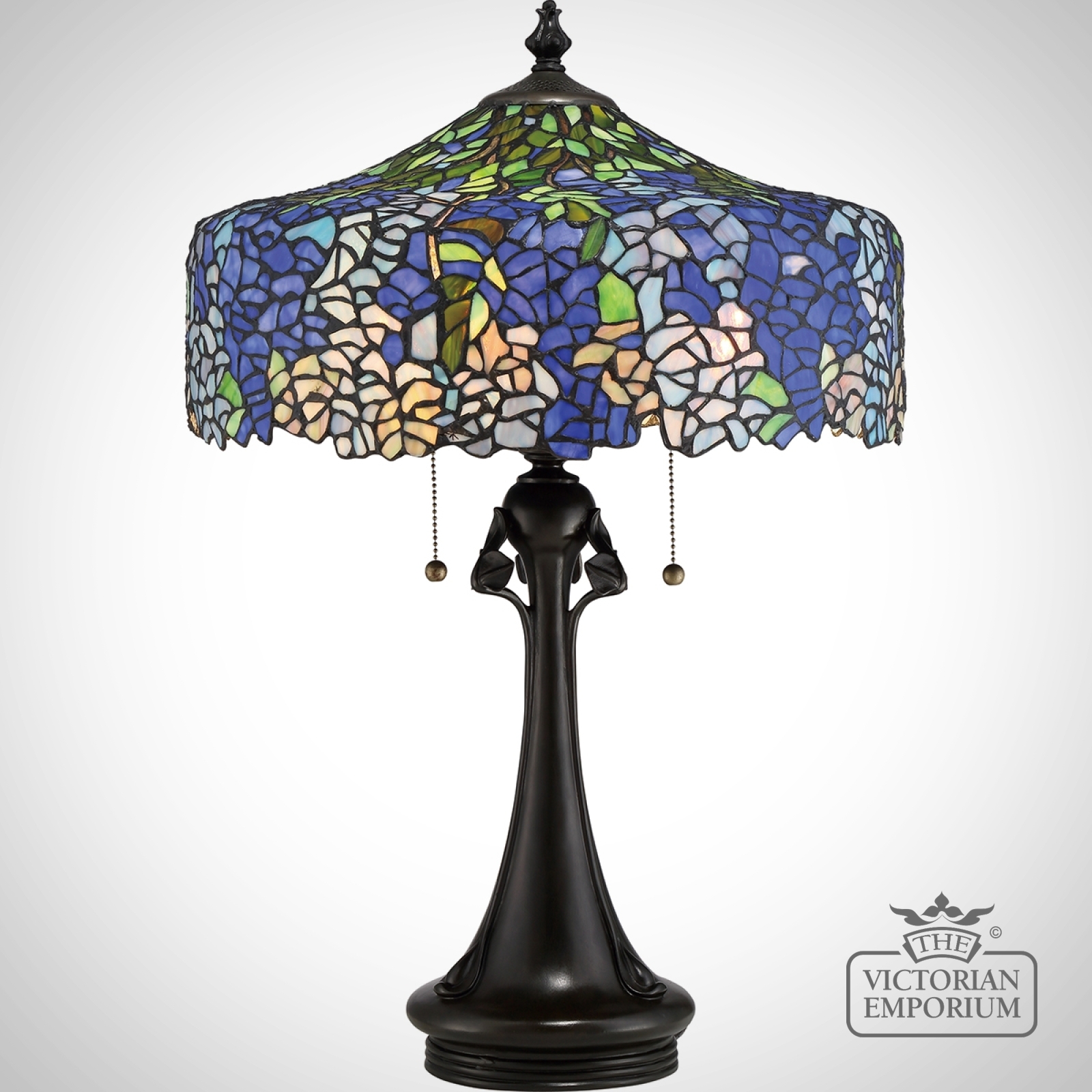 A beautiful table lamp featuring Tiffany glass in colours of cobalt, green and pastels with a black base