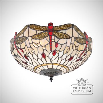 The Dragonfly flush ceiling light in beige is a traditional interpretation of the iconic Tiffany Dragonfly design, in natural muted colours with coloured glass beading and teamed with a dark bronze effect fitting