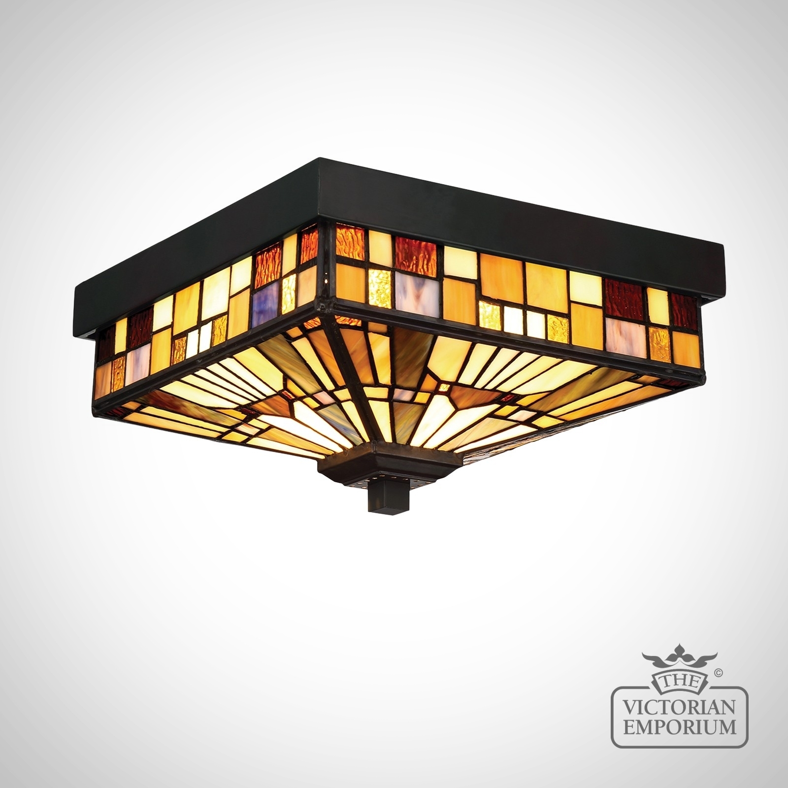 About this Tiffany style light: This outdoor ceiling light has a pyramid shade with a classic geometric design and includes art glass in shades of amber, cream and tan