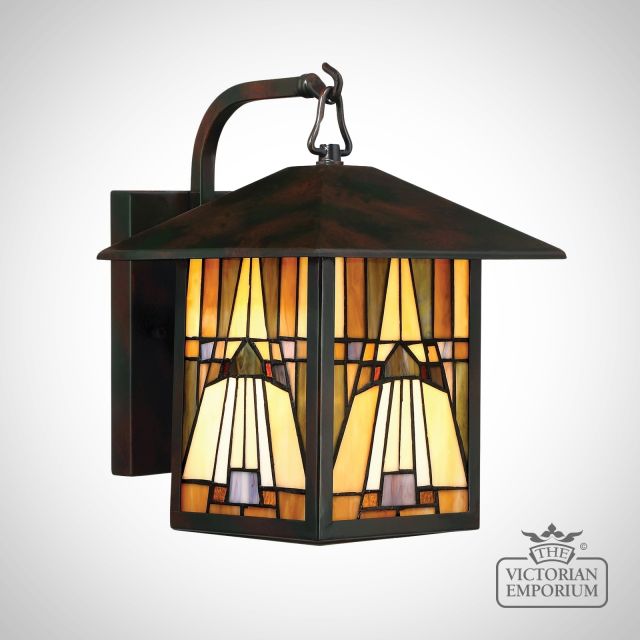 About this Tiffany style light: This outdoor wall light has a rectangular shade with a classic geometric design and includes art glass in shades of amber, cream and tan with black iron plate
