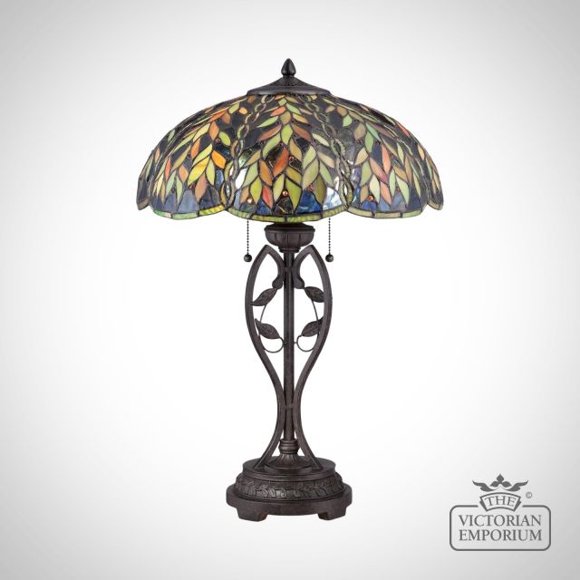 About this Tiffany style light: The forest and lush greens used on this organic motif enhance the intricate leaf pattern used on the shade and base. Bella is a perfect blend of natural elegance and traditional appeal. The shade contains 632 art glass pieces and the beautiful Imperial Bronze base is captivating with its delicate and open style