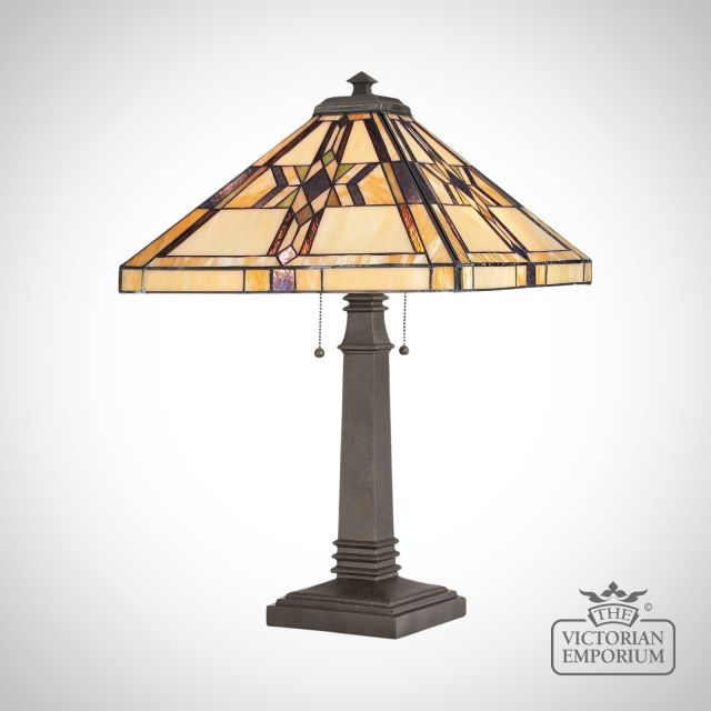 About this Tiffany style light: This classic American Mission style lamp features warm colour tones of amber, brown and buttery yellow, creating an inviting appeal. The Vintage Bronze finish authenticates the historic design