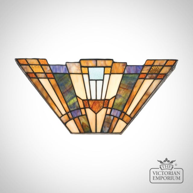 About this Tiffany style light: This wall light has a pyramid shade with a stepped border and the classic geometric design includes art glass in shades of amber, cream and tan, accented with glass pieces in sapphire blue and rich green. The base features linear geometric details to complement the shade