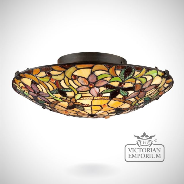 About this Tiffany style light: This pretty flush mount light has a hand-crafted, art glass shade created in hues of amber, caramel, ginger and emerald. The warm colour palette creates a harmonious balance of light, and the complementary base is finished in a Vintage Bronze.. The glass is arranged in a classic Art Nouveau pattern