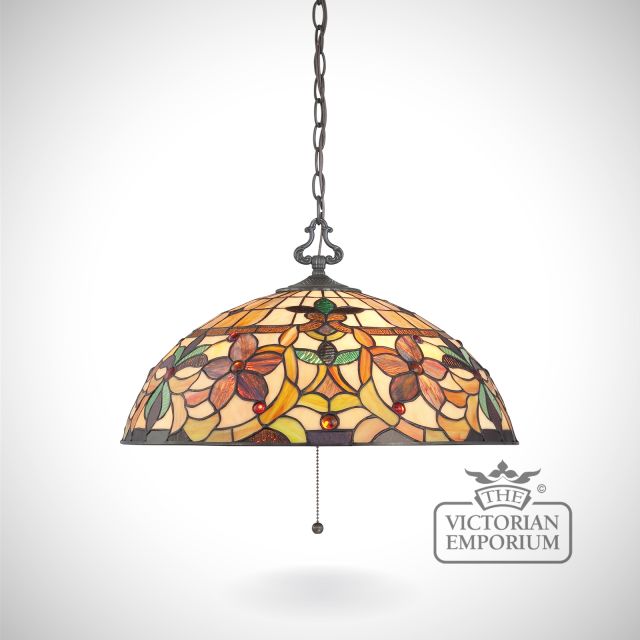 About this Tiffany style light: The Kami pendant features a hand-crafted, genuine art glass shade created in hues of amber, caramel, ginger and emerald. The glass is arranged in a classic Art Nouveau pattern. The warm colour palette and the complementary base finished in a Vintage Bronze create a lovely vintage feel