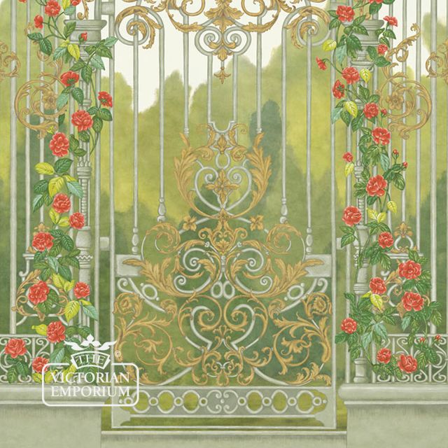 Tijou Gate is a wonderfully ornamented panel design of ironwork and florals in bloom, inspired by the elaborate iron screens designed and fabricated by Jean Tijou, French master blacksmith and designer