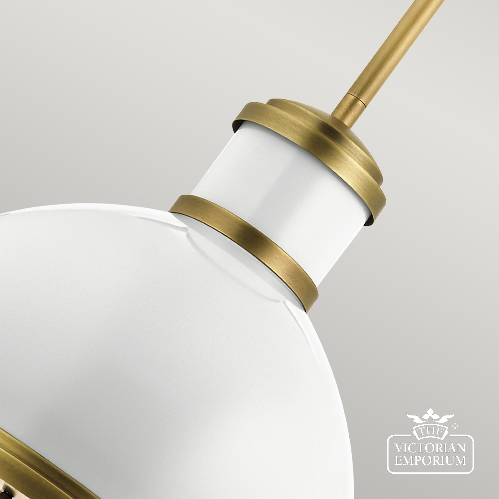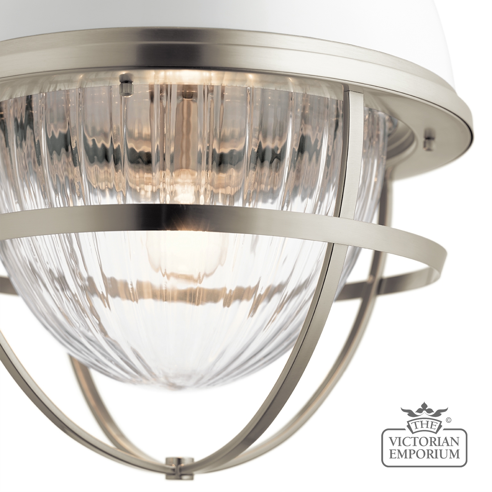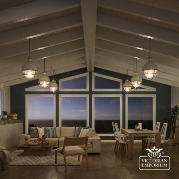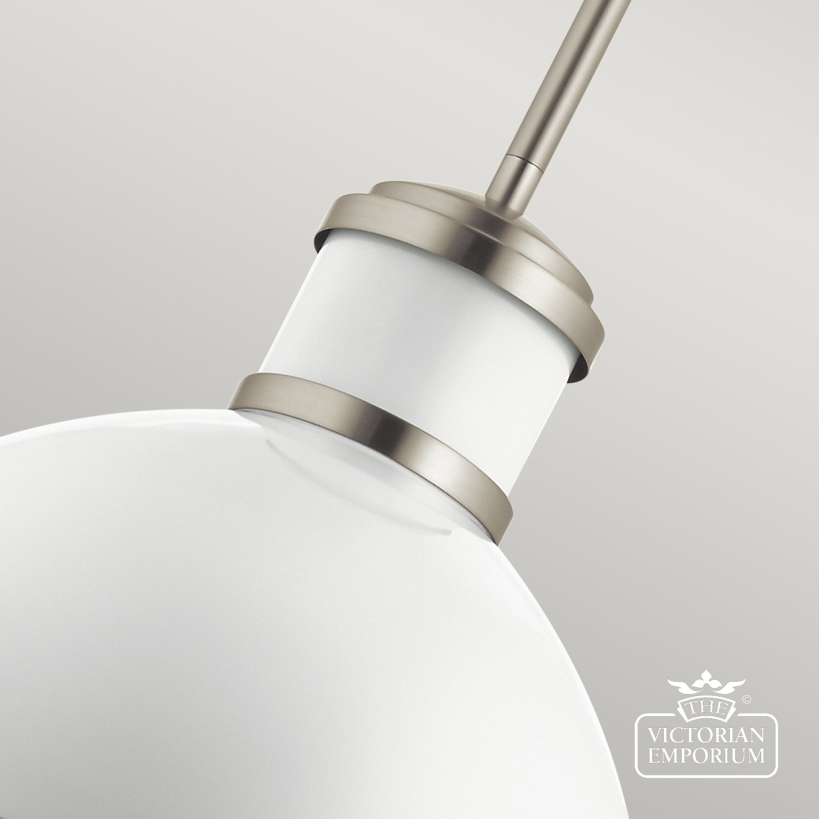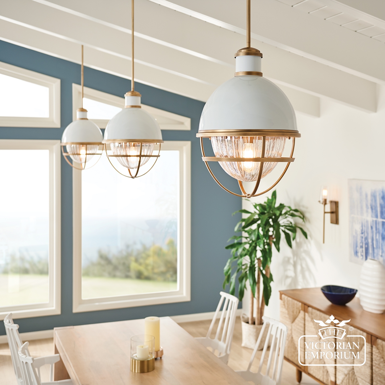 This stylish range is avaialble in Natural Brass or Brushed Nickel & White, a modern design with nautical inspiration and high gloss white dome shades.