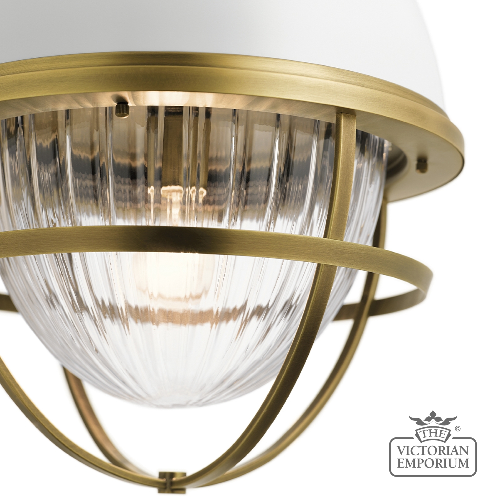 Fresh and stylish, the Tollis range is designed with a high gloss white dome, clear ribbed glass, and a Natural Brass or Brushed Nickel finish