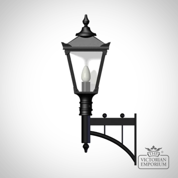 This is a short simple heritage cast iron wall bracket topped with a cast iron and glass lantern in a traditional shape