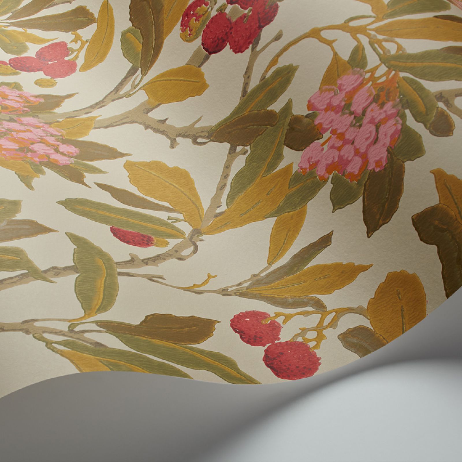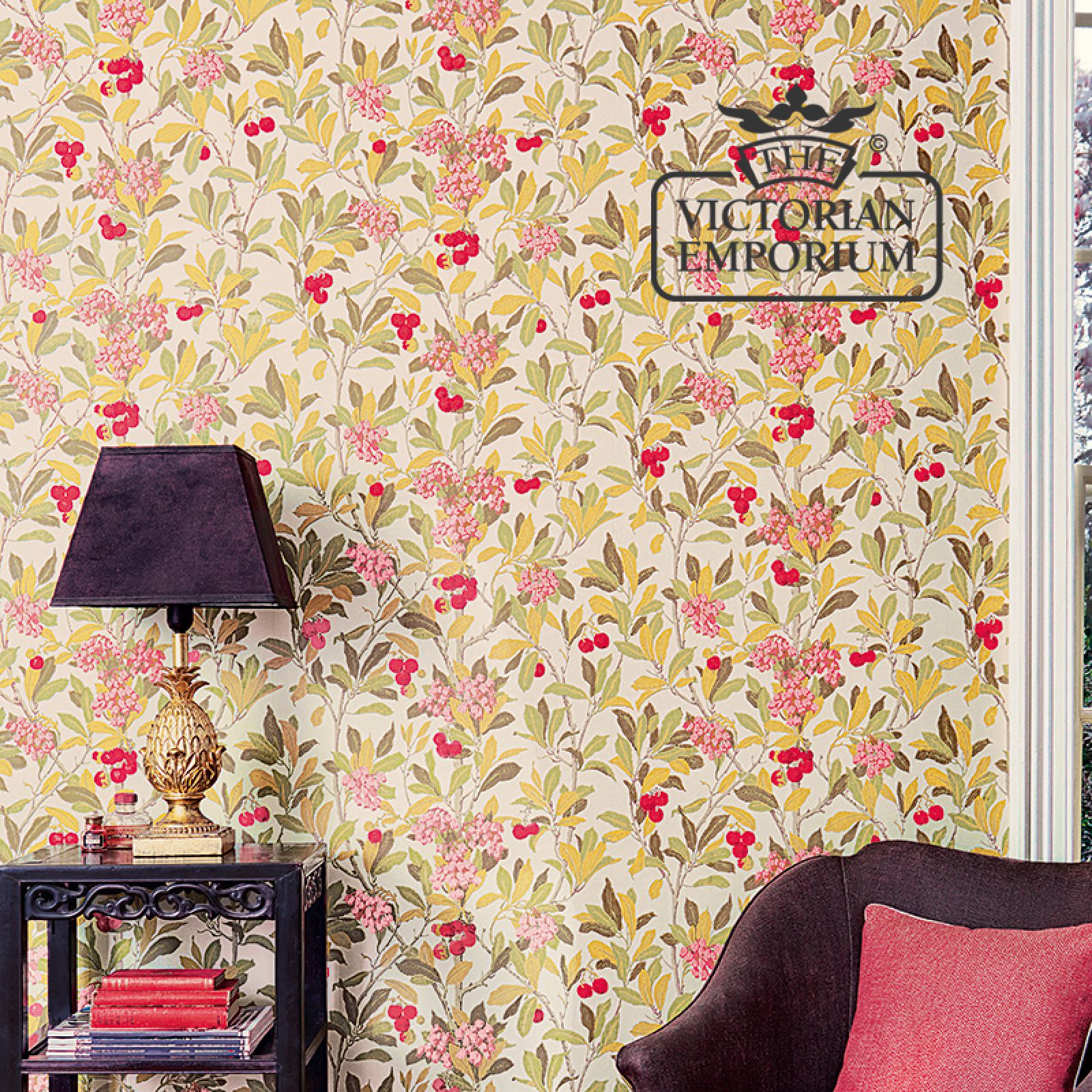 A stunning block printed design from the archives reproduced here as a classic surface printed wallpaper. Available in three opulent colour-ways of pink and khaki, scarlet and green and pink and linen, this wonderful old print blends an arts and crafts ancestry with a classical twist to produce a truly majestic wallpaper.