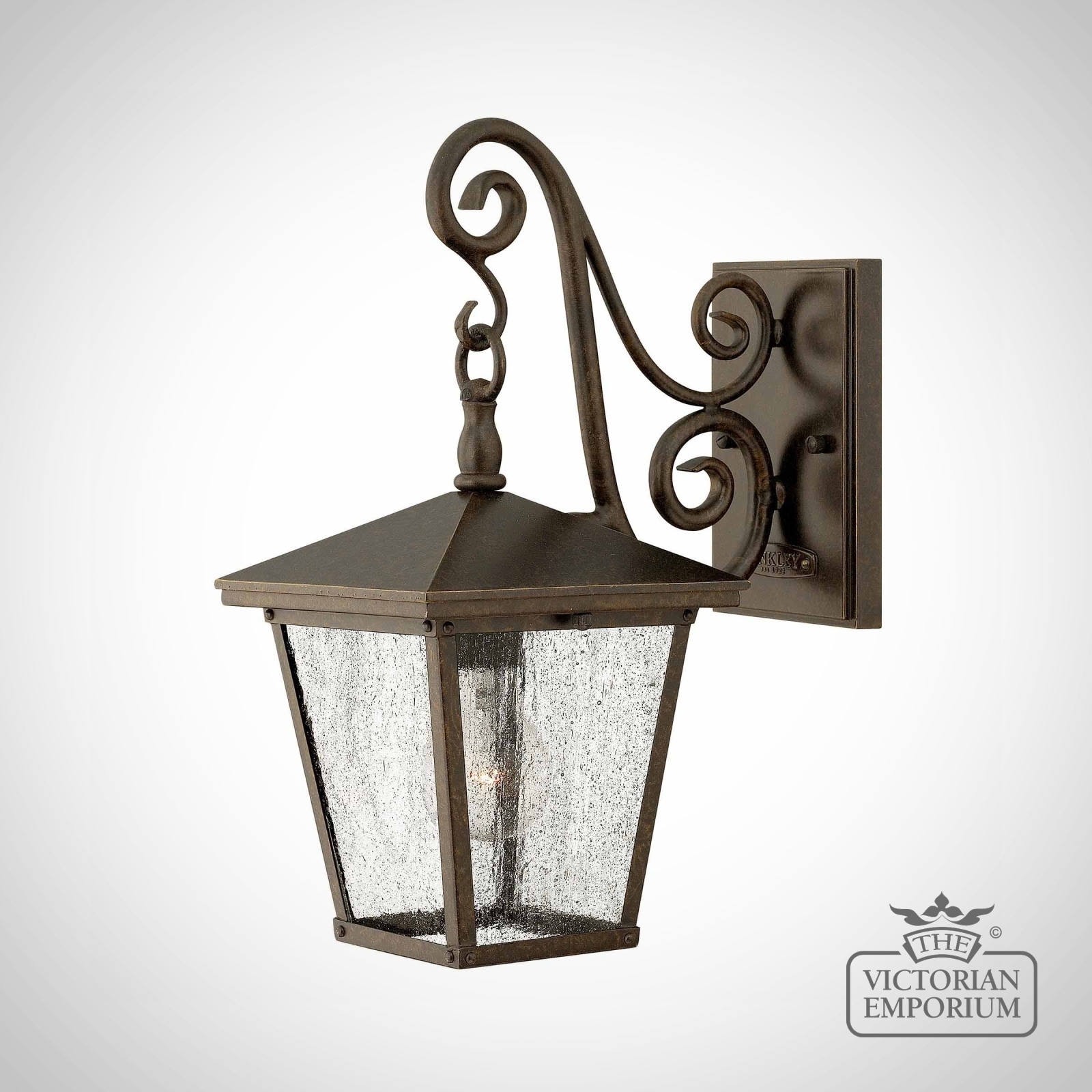 Trellis lanterns have dense clear seedy glass. The large scroll arm detail, cast loop finial and true rivet detail create a refined elegance.