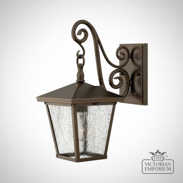 Traditional European hanging wall lantern design in a Regency Bronze finish with clear seedy glass